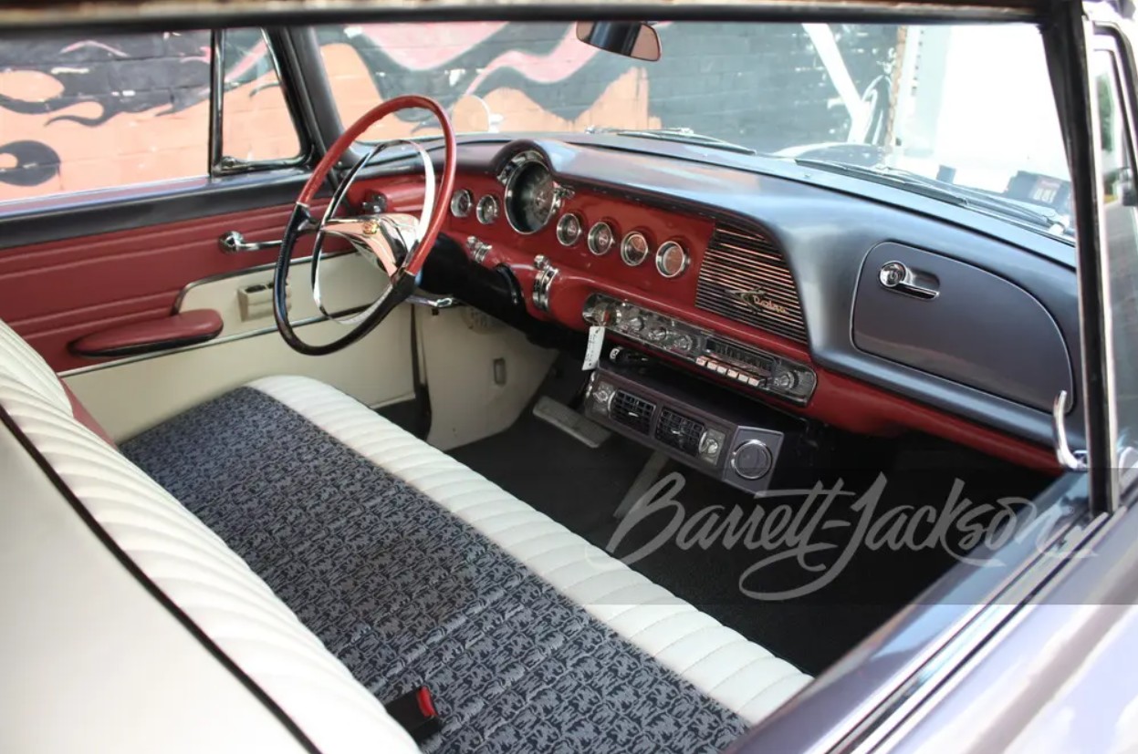 Under the hood: a rebuilt 315ci Super Red Ram V8 engine mated to a push-button PowerFlite automatic transmission, all riding on wide whitewall tires. From the two-tone Sapphire White and Wedgewood Blue paint to its period-correct chrome and sweeping tailfins, this Lancer doesn’t just show up, it takes over.