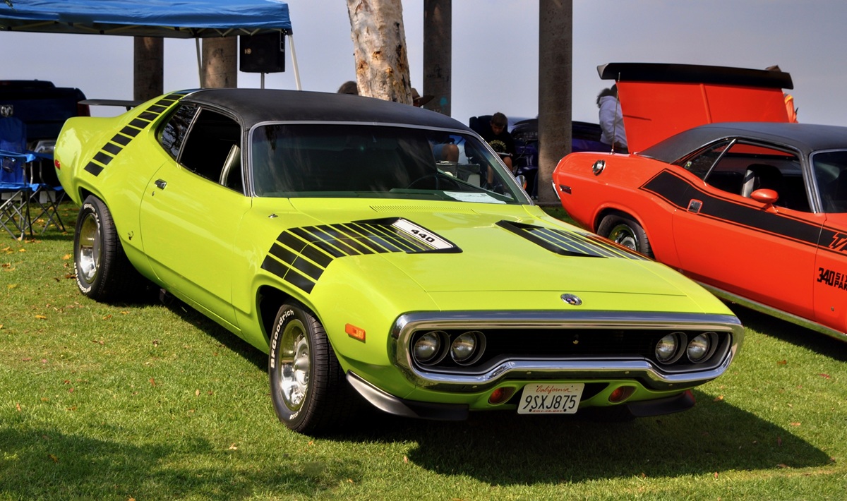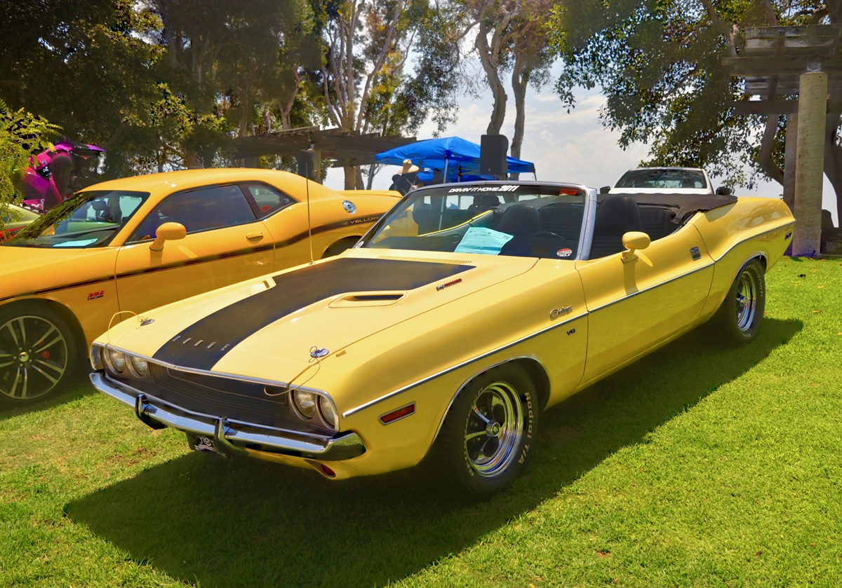 Dodge’s entry into the Pony Car market came late in 1969 with the release of the 1970 line of Challengers. Parked next to a Yellow Jacket modern Challenger, a sano 1970 Challenger Convertible with the optional E55 340-cid 4-bbl powerplant. Required with that powerplant were the 15 x 7 Rallye wheels and W35 collapsible spare tire. This Challenger V8 example has optional bumper guards and V21 black-out treatment. Period aftermarket wheels, Keystone Klassics, were added which deliver a nostalgic touch that relates to what typical Challenger owners were doing in the 1970s.