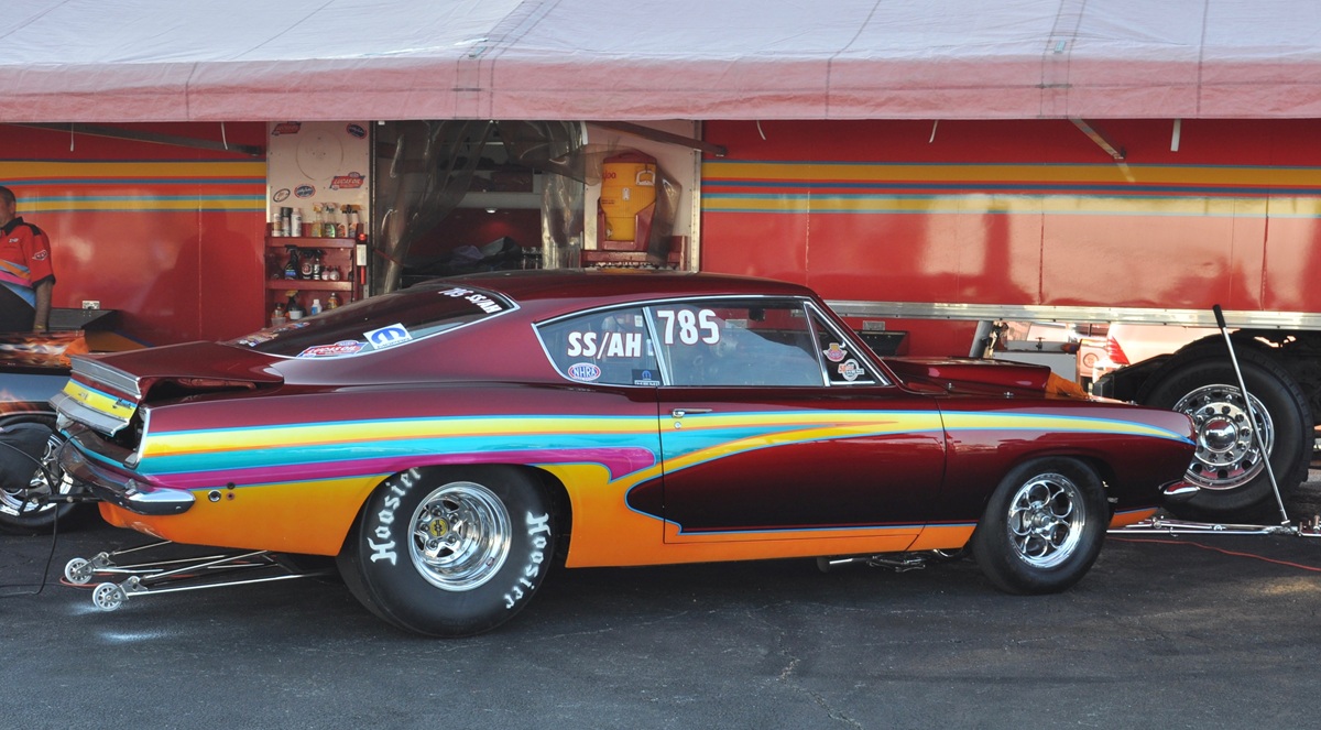 Caged 1969 Plymouth Valiant 2-door Sedan running dual classes, A/FX and D/G, a body style ideal for drag car, however not often seen today!