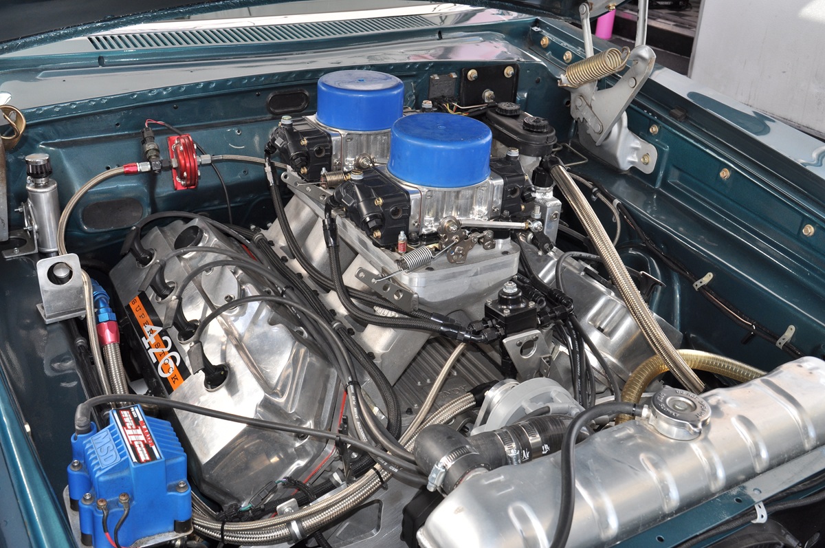 Under the hood of long-time 1962-65 Mopar specialist Bob Munoa’s 1965 Plymouth Belvedere drag car, a Keith Black aluminum Gen II HEMI engine, INDY aluminum cylinder heads and tunnel ram: serious performance!