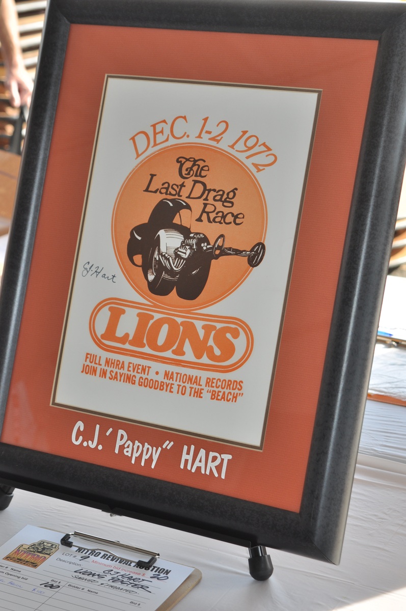 Signed by C. J. Hart, a framed poster of “The Last Drag Race” event at Lions Drag strip, December 1-2, 1972. C. J. “Pappy” Hart was instrumental in the Southern California early development and served as Track Manager of Lions from 1965 to 1971.