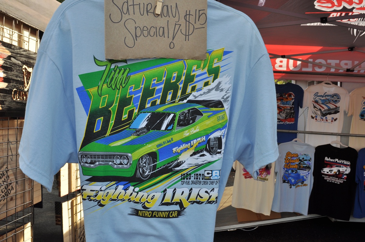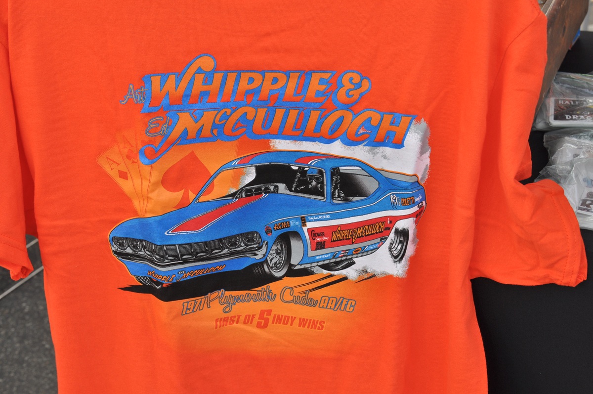 Well-detailed artwork on the early ’70s Mopar Funny Car T-shirts! 1971 “Whipple & McCulloch” Barracuda and the ’72 Satellite “Fighting Irish” car of Tim Beebe, just a couple examples of the high-quality fashion items at the CHHR!