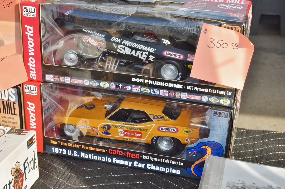 Die casts of the 1973 Don “Snake” Prudhomme Barracudas in 1:18 scale were available, the Black Primer “Snake III” and Care*Free Gum car, not easy to find!
