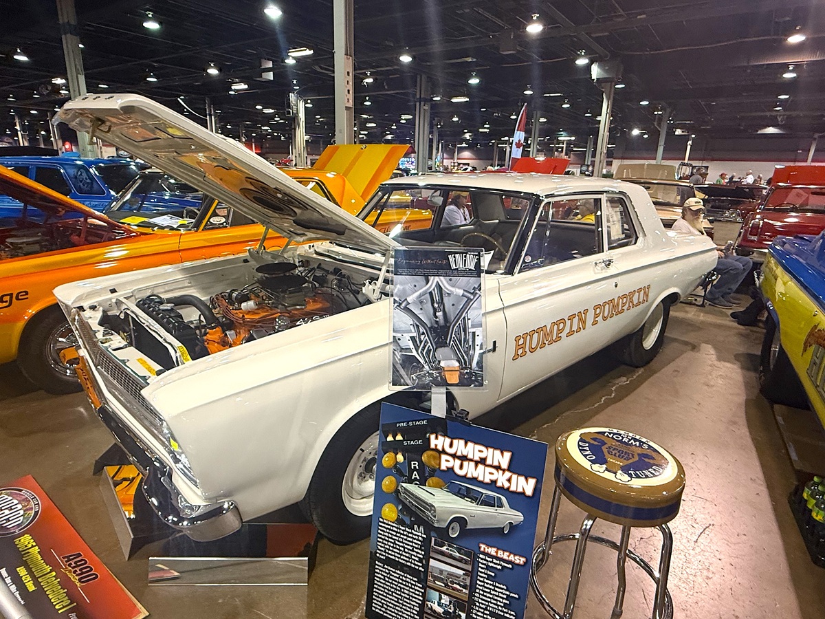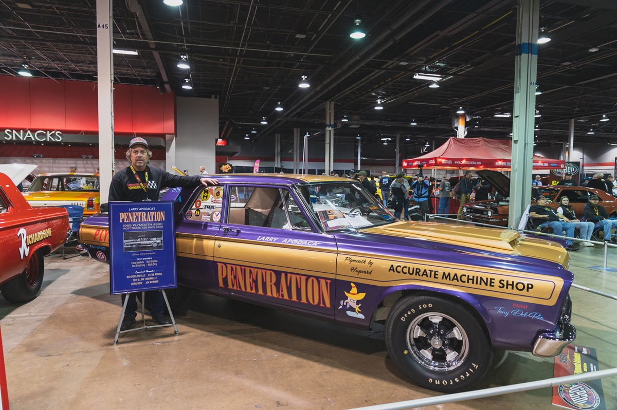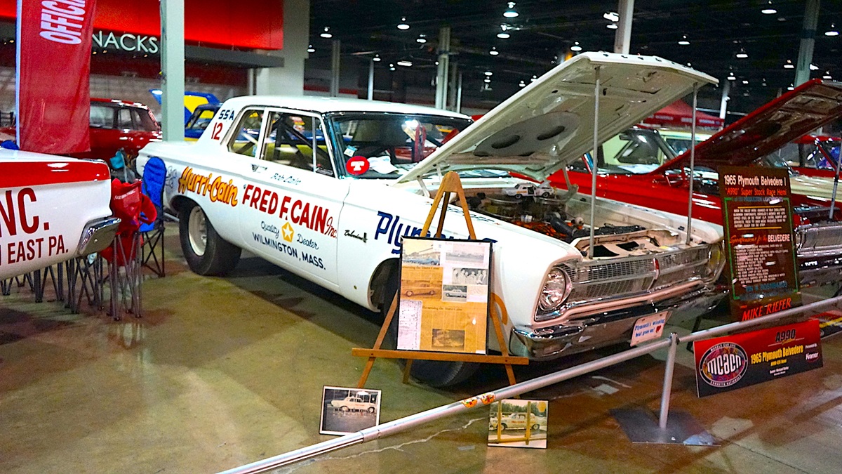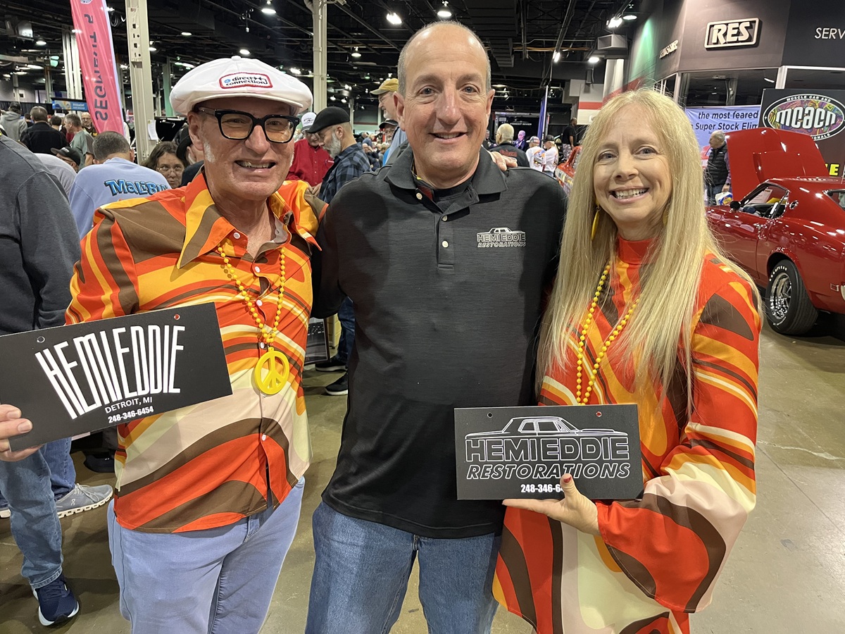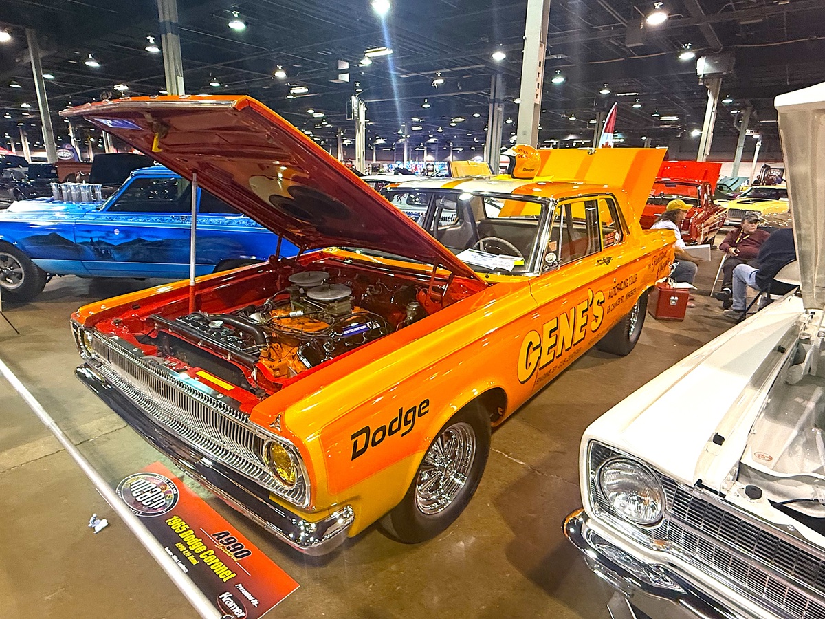 Another supporter of the A990 Invitational was longtime restoration on these HEMI Super Stocks is Ed Strzelecki of HEMIEDDIE Restorations of Rochester, Michigan. “I was honored to support Jim Kramer of Kramer Automotive Specialties in putting together the 60th Anniversary Display at MCACN of the 1965 A-990 Factory Super Stock Cars. The display featured 13 A-990 Dodge and Plymouth HEMI Super Stockers. What was special about the display was that nine cars had some degree of my involvement,” said Eddie. “Here are some of the cars I worked on that were on display. The 1965 Dodge A990 Coronet of Jim Kramer was a great project. It became an altered wheelbase car back in the day and was raced as the ‘HEMI a Go-Go.’ It required significant cleanup and paint matching on the hood. We had to sandblast the engine compartment, trunk and interior to remove the dirt and debris. We then painted those areas black, but we didn’t mess with the vintage custom paint on the body,” said Eddie.