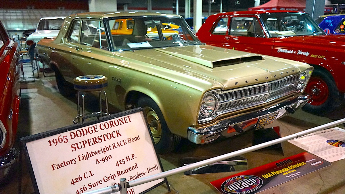 Among the stellar, astounding, remarkable, colorful and eye-popping vehicles at the recent Muscle Car and Corvette Nationals (MCACN), the cars in the ‘A990 Invitational’ almost looked like plain Jane cars that our grandparents drove to church or the supermarket. Devoid of many exterior frills other than the hood scoop, the 1965 HEMI Package Cars were all business when they came off the assembly line. Like their 1964 Super Stock Mopar siblings, they were turnkey and race-ready. Just uncap the exhaust pipes, bolt on some slicks and they were ready for action down your local strip. These cars had racers defecting from the Chevy and Ford camps and coming over to Dodge and Plymouth.