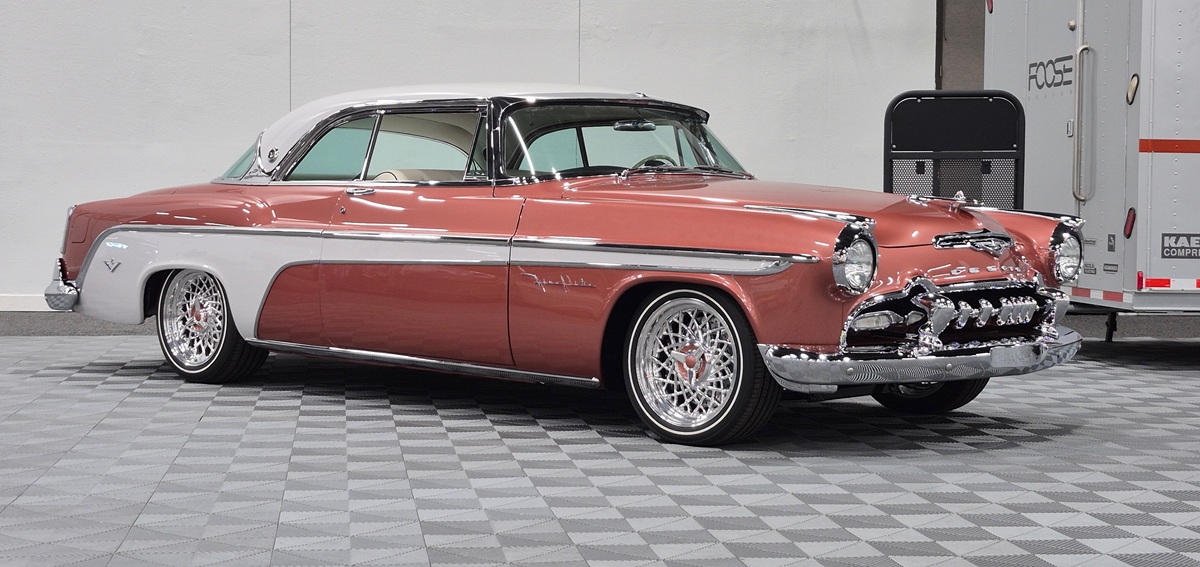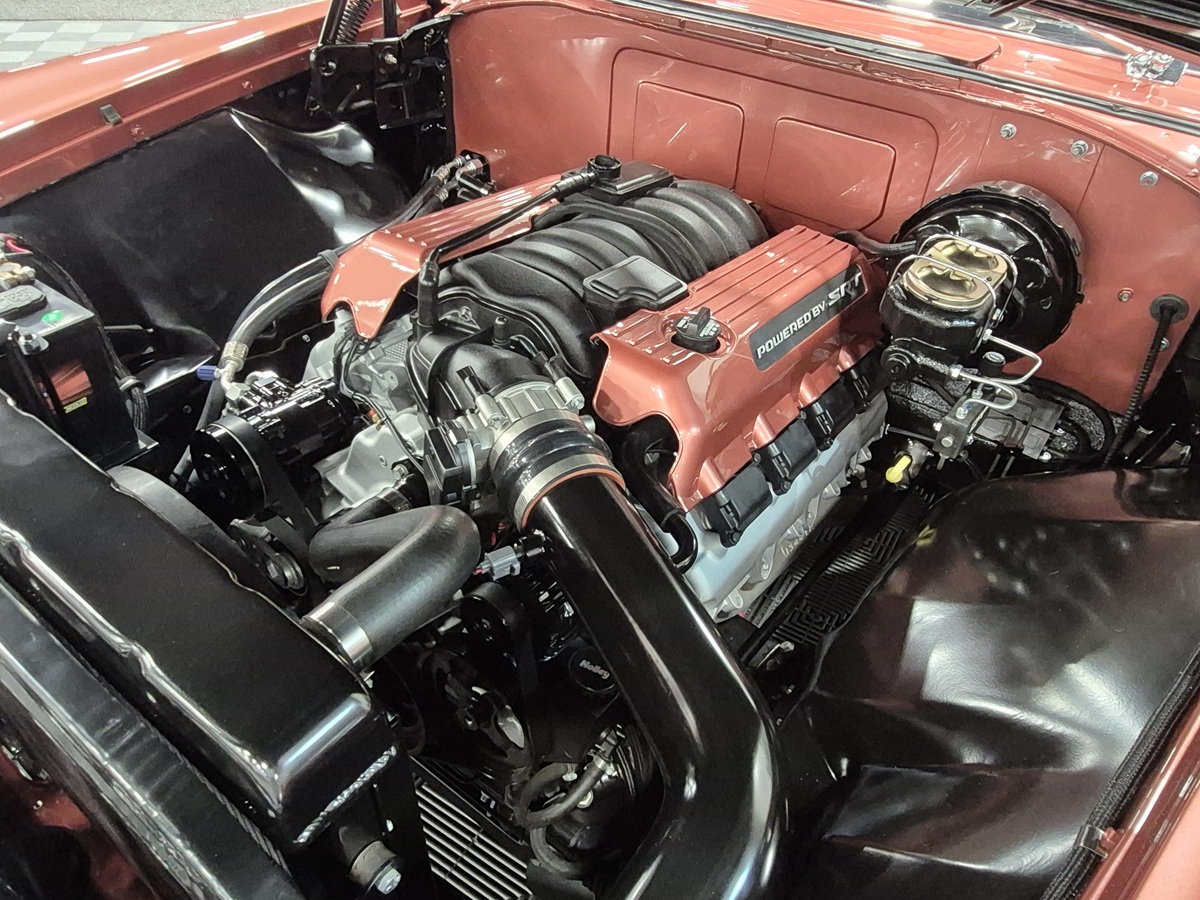 This 1955 DeSoto Fireflite is a bold fusion of Heritage and Horsepower – where vintage elegance meets modern fury, thanks to an SRT® HEMI Gen III powerplant. Built by the team at Chip Foose’s shop, the car retains its stock frame from the cowl back, while a custom in-house front suspension sets the tone up front. A 9-inch Ford rear, 4-wheel Baer brakes and Magnaflow exhaust round out the performance upgrades.