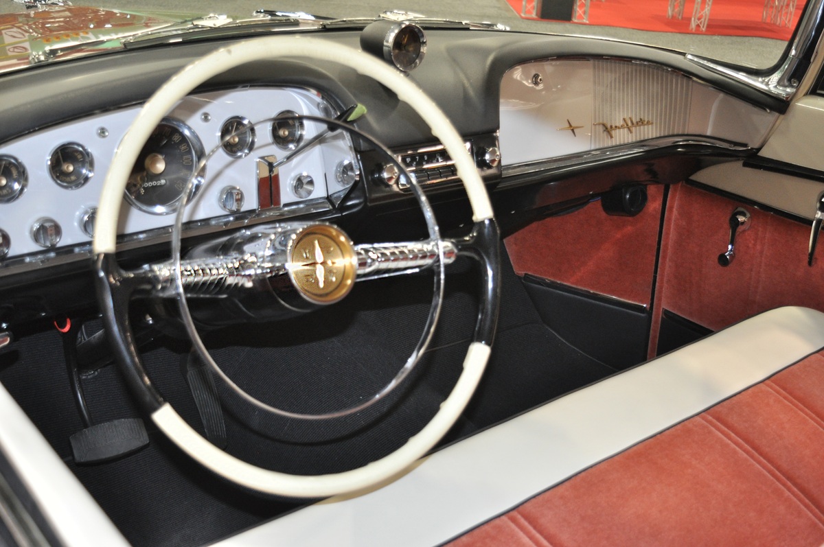 Factory styling cues from Virgil Exner’s revolutionary “Forward Look” design remain intact – most notably the distinctive miniature “sun cap” over the windshield and chrome-accented headlamps. Originally known as the Series 21, the 1955 DeSoto Fireflite Sportsman packed a 291-cubic-inch HEMI V8 pushing 200 horsepower with 4-barrel induction and dual exhaust.