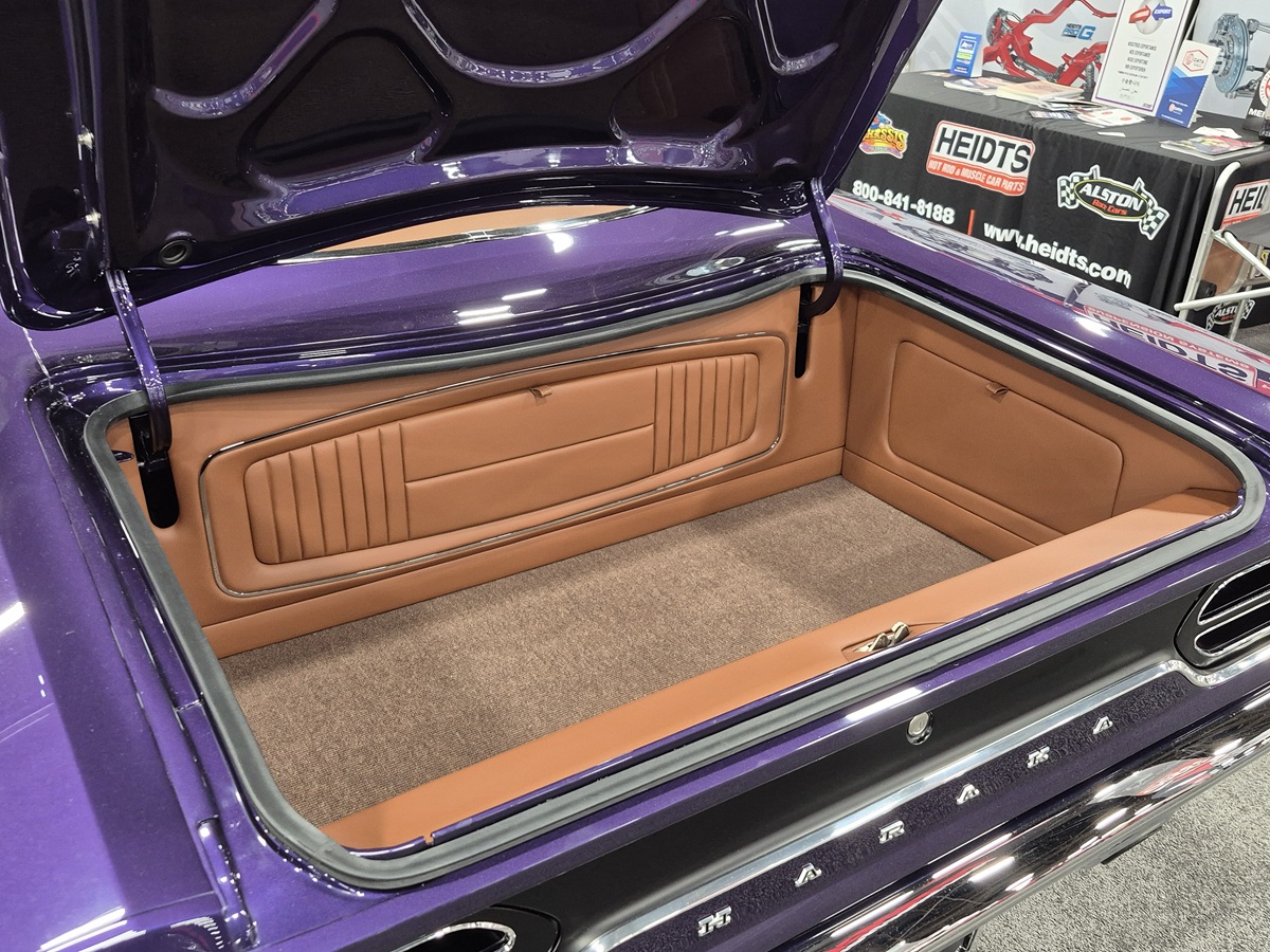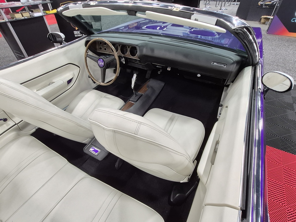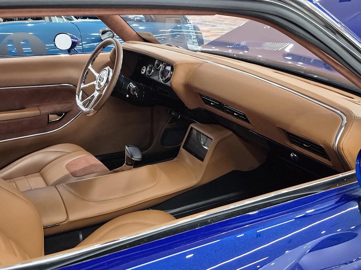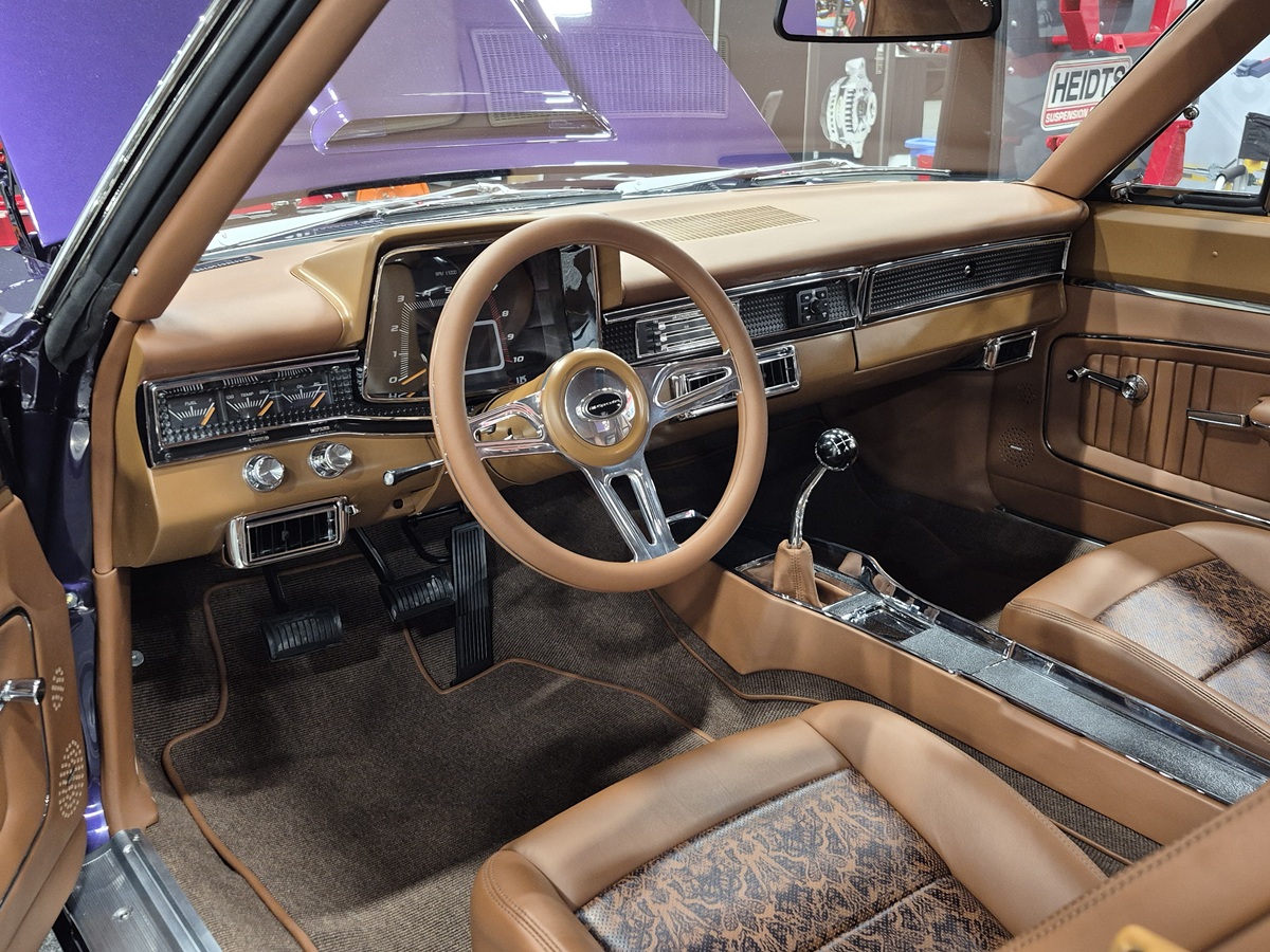 A highly creative interior mashup – starting with a 1966 Plymouth Fury dashboard as the centerpiece. The custom touches continue with a ’72 Duster center console, a ’Cuda Gran Coupe overhead console and one-off Robert Graham-themed upholstery. Every detail is a unique design statement.