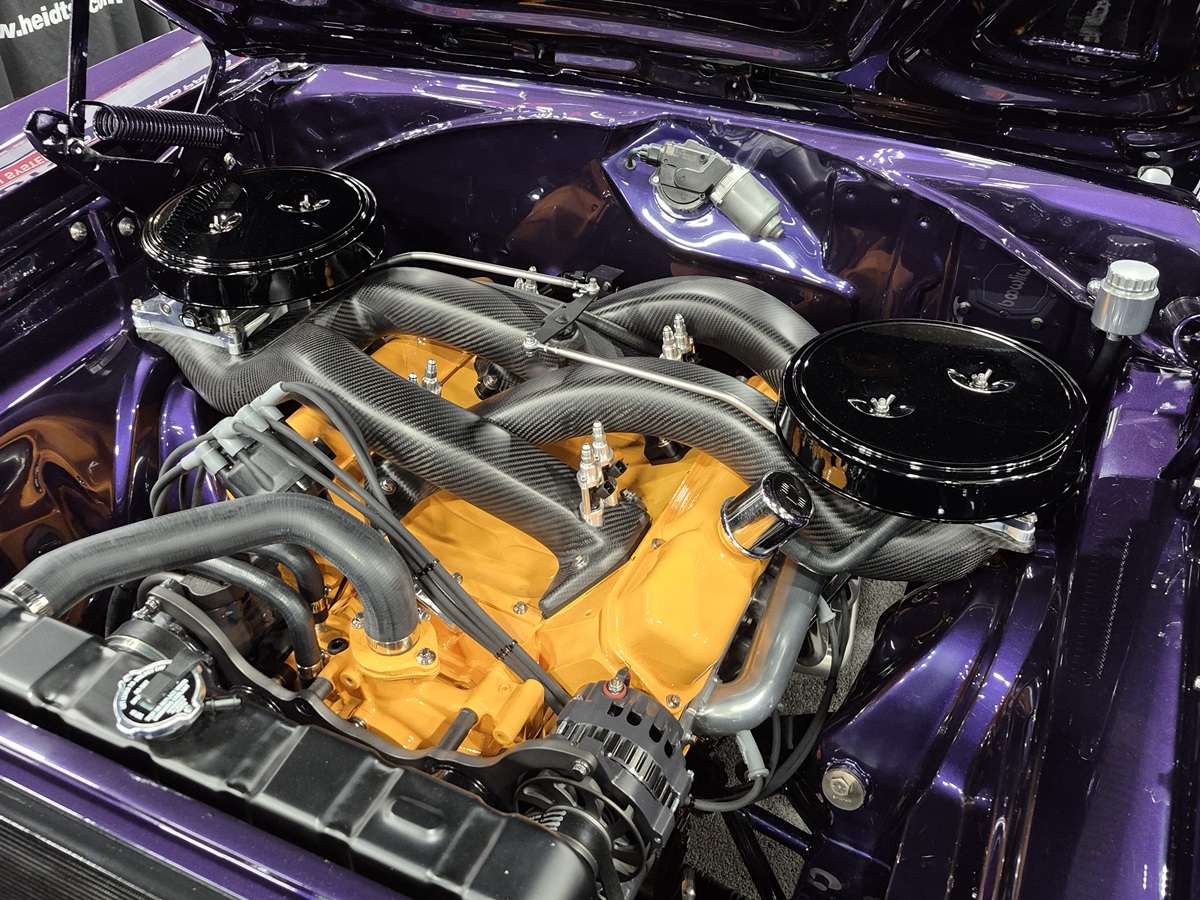 494-cube Mopar big block wedge, MoTeC EFI on carbon fiber long ram intake, Tremec TKX trans, carbon fiber mufflers and exhaust system.