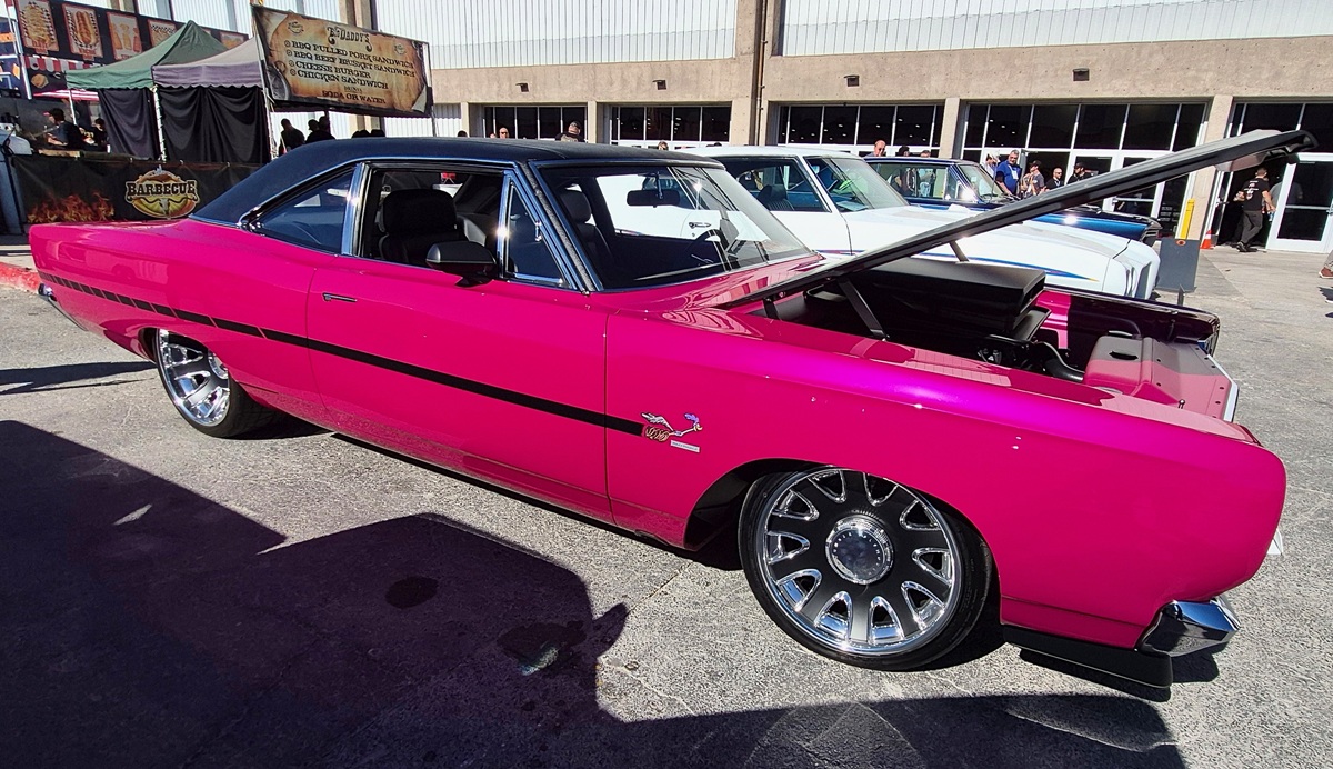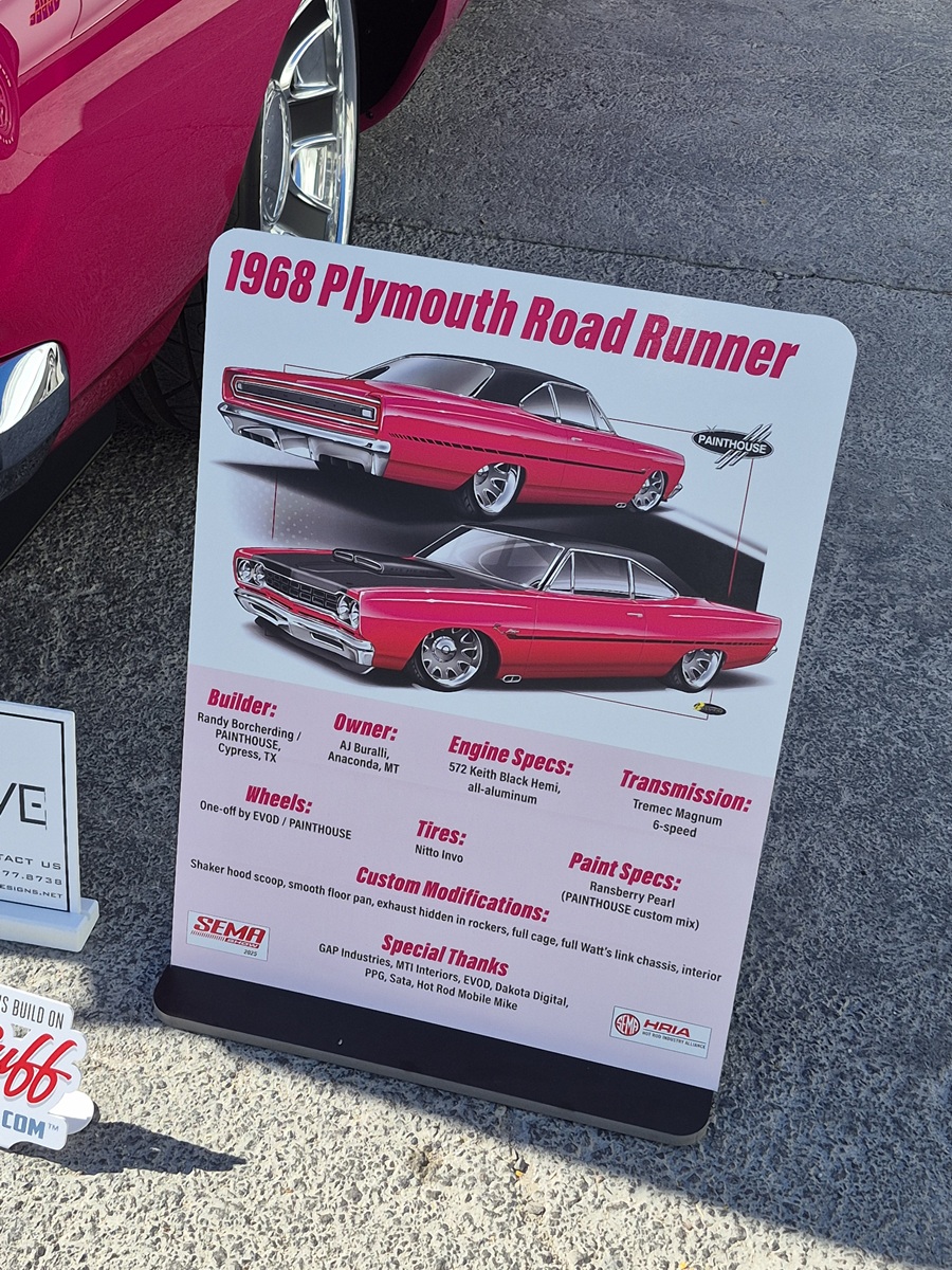 Basking in the Nevada sun, this 1968 Road Runner Coupe – built by Randy Borcherding of PAINTHOUSE (Cypress, TX) – turns heads in a custom-mixed Ransberry Pearl finish. It rides on one-off Evod wheels wrapped in Nitto Invo rubber, blending classic muscle with modern stance.