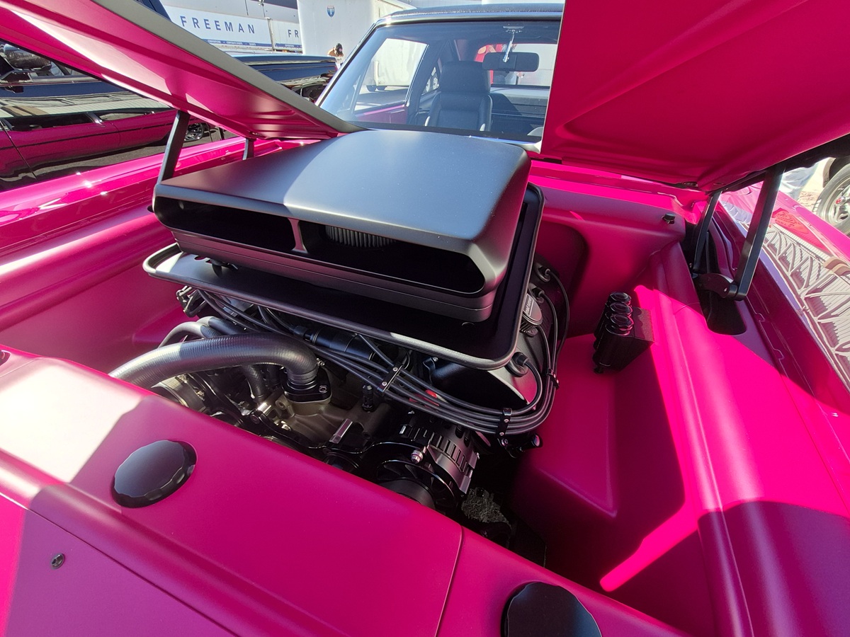 Tucked beneath a custom-fabricated Shaker hood scoop is a beast – an all-aluminum Keith Black Gen II HEMI engine, bored and stroked to a monstrous 572 cubic inches. A powerplant this well-detailed is as serious as it looks.
