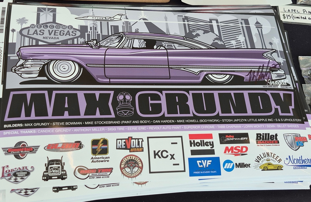 Tucked between the North and West Halls, the “Art Walk” is a must-visit for anyone who appreciates automotive fine art. Established years ago through the efforts of car show pioneer Bob Larivee, it remains the go-to spot at SEMA to meet top artists and view their latest creations. This year, Tom Fritz debuted an original oil-on-panel masterpiece – featuring a front-engine, supercharged HEMI dragster with weed-burner headers, spinning slicks, pulling the front wheels and proudly wearing an Isky Polydyne Profile Cams decal. As always, Fritz nails the authentic details.
