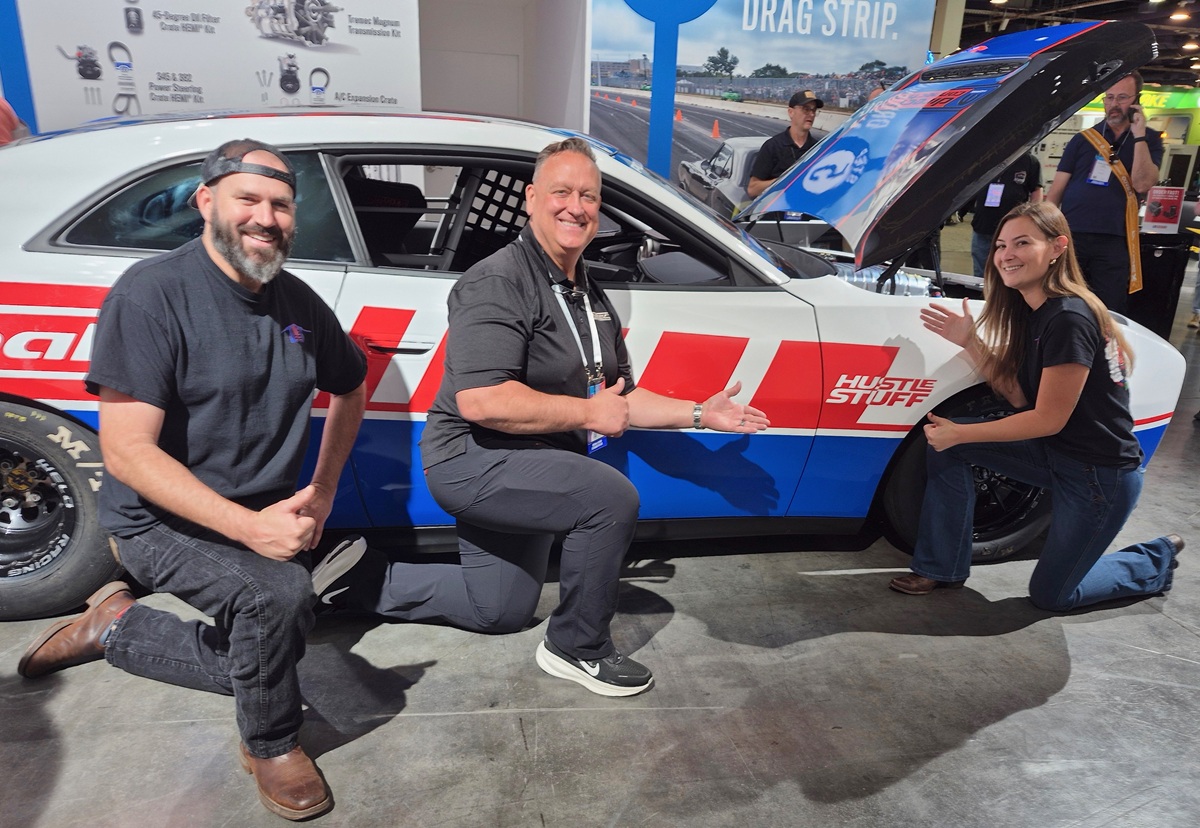 The new 2026 Charger Hustle Stuff Drag Pak was the center of attention at the Direct Connection portion of the Mopar exhibit, and here’s Direct Connection’s Senior Account Director Chuck Spieser (center) explaining the details of the new drag car from Mother Mopar to ace race fabricator Jason Kastner (left) and drag racer Morgan Evans.