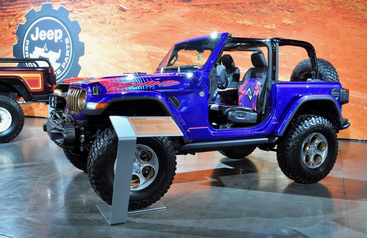 A throwback to the size of the 1940s wartime Jeep Willys (MB), Rewind is a nostalgic take on all things ’80s and ’90s. The general idea that the Jeep brand designers had was a reimagined, simplified Wrangler that takes you back to a timeframe when neon colors were the rage!