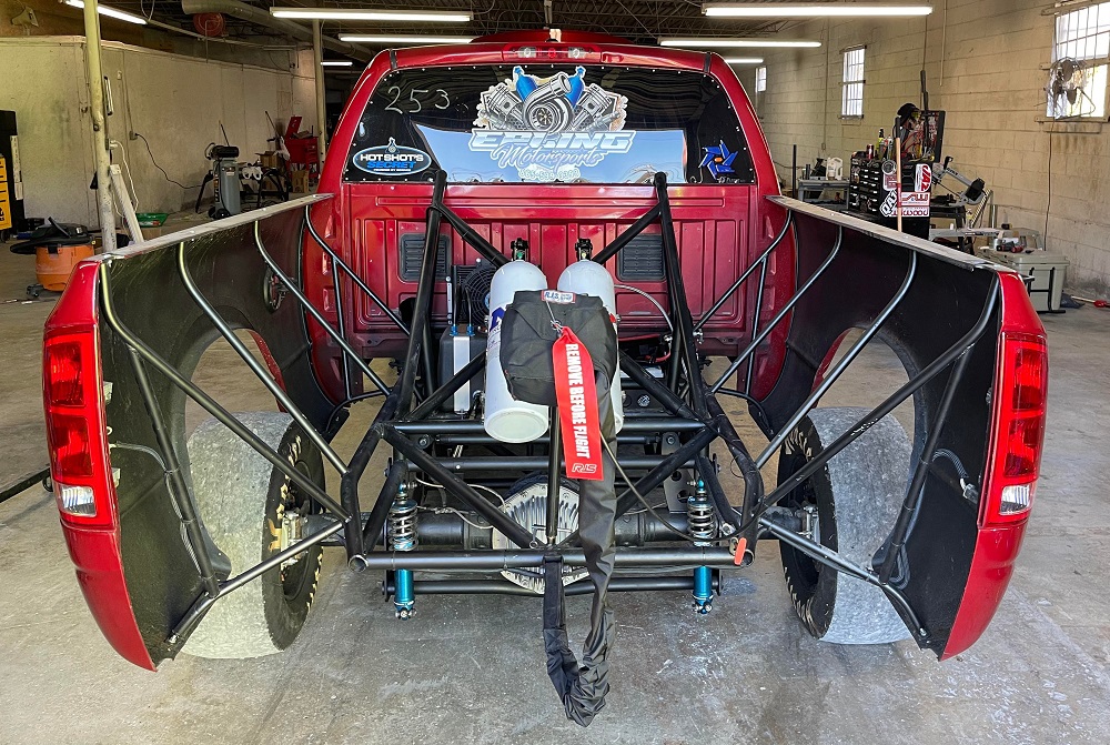 When you look at Logan Epling’s Dodge Ram 3500 from the front or side, it looks pretty much stock, shy of the wheel/tire fitment and the hole in the hood. This truck has all of the factory steel body panels with the only major change to the sheet metal being the lack of the bed floor. When looking through the open cargo area, you can also see that the rear frame section has been replaced with a custom tube setup, helping to reduce weight and improve stability under power. Inside, it has the factory dashboard, door panels and front seats, but the rear seating assembly was removed when the cage was installed. While some things have been removed, this Dodge Ram 3500 still weighs almost 5,200 pounds when it tears down the drag strip, sprinting from a stop to 140 miles per hour in just over 5 seconds – and Logan Epling plans to improve on that.