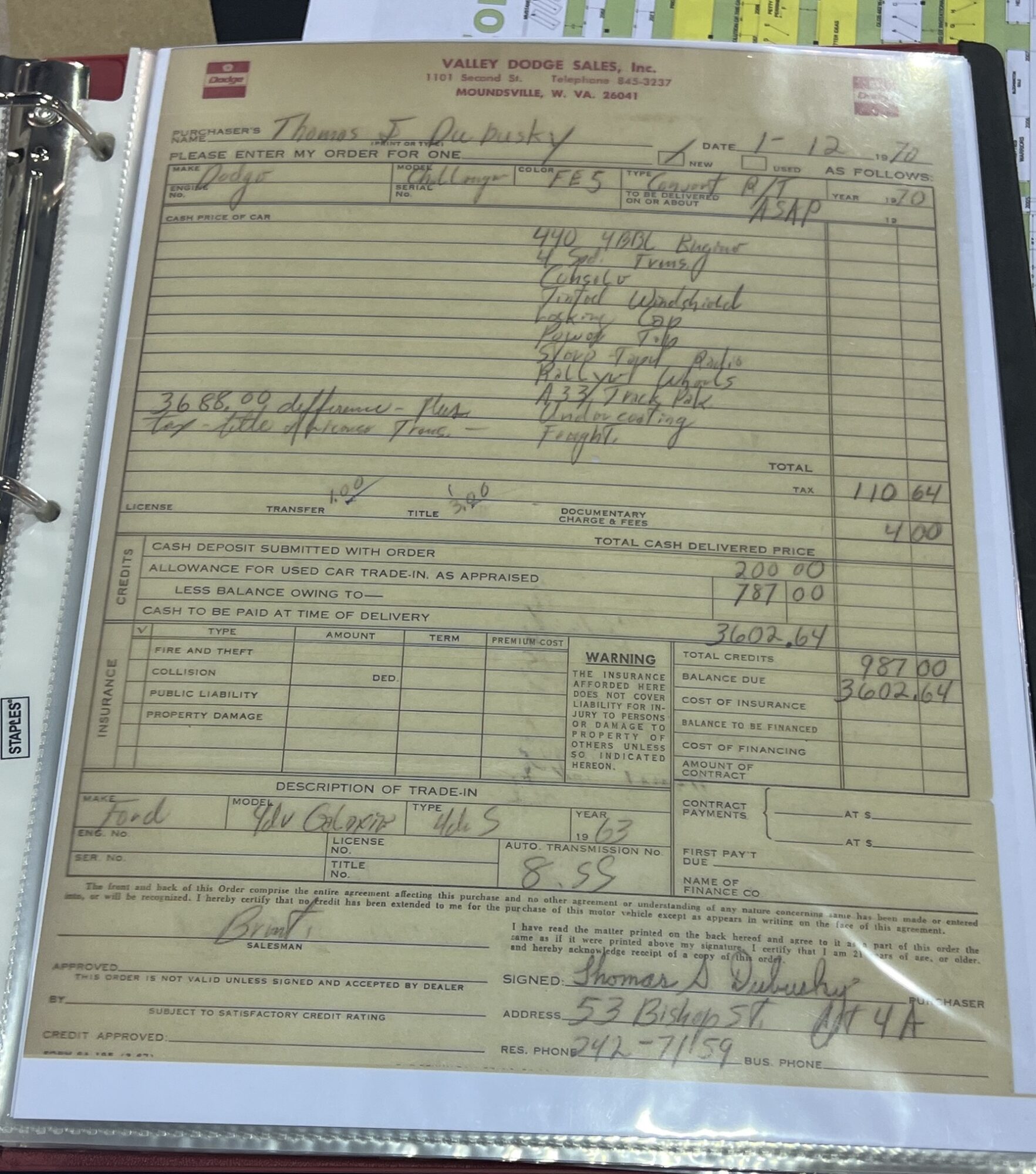 After Thomas made up his mind on the color, engine, transmission and other options, he headed to another dealer, Valley Dodge Sales Inc. in Wheeling, West Virginia, to get the ball rolling. “I ordered the Challenger on January 12, 1970. I wanted to get the 426 HEMI®, but the salesman sort of talked me out of it,” exclaimed Thomas. “I could kick myself now for not ordering the HEMI, but I decided on the 440 Magnum and four-speed. I put a down payment on the car and it showed up February 6th of that year. The day it came in, I went right down to the dealer and drove the Challenger to drive it home. It was amazing to feel the power and torque of the 440 and go through the gears, I fell in love right away. I had to park it on the street as I didn’t have a garage where I was living back then, but I kept it clean by washing it once a week and vacuuming the interior. I liked this car so much; I changed the oil and filter every 1,500 miles!”