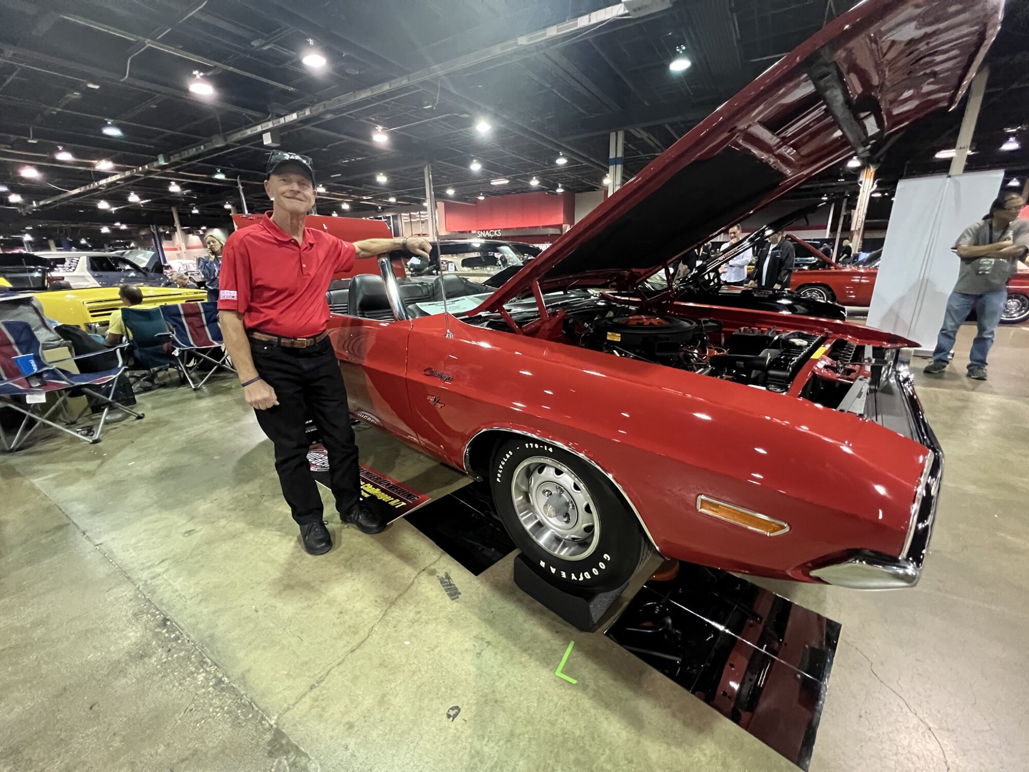 Thomas Dubusky (76) of Lexington, Ohio, a retired engineer, purchased this stunning Bright Red 1970 Challenger R/T Convertible brand new. He was only 23 at the time and it was his first year out of college and he wanted a new car. “I thought I wanted a Corvette but when the new Plymouth ‘Cudas and Dodge Challengers came out in 1970, I changed my mind,” smiled Thomas. “I then had to decide between a ‘Cuda and a Challenger, so I went to my local Dodge dealer, Hopkins Motor, and they had a Plum Crazy Challenger with a white interior in the showroom and knew right away I wanted a Challenger. So, I picked up a Challenger brochure from the dealer and I went home that night and checked off the options I wanted. When it came to deciding on the color, I chose red with a black interior. My cousin, who was a few years older than me, had a new 1964 ½ Ford Mustang and he ordered it red with a black interior, so I really liked the way that looked and that’s how I chose the color.”