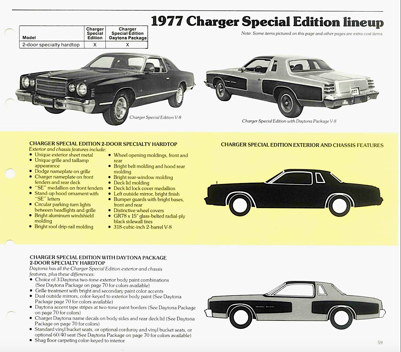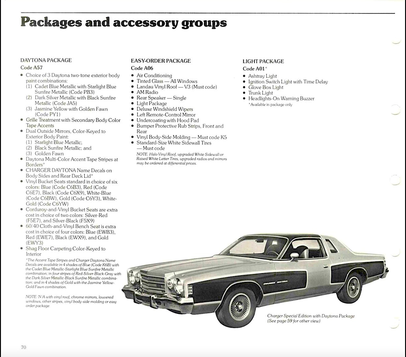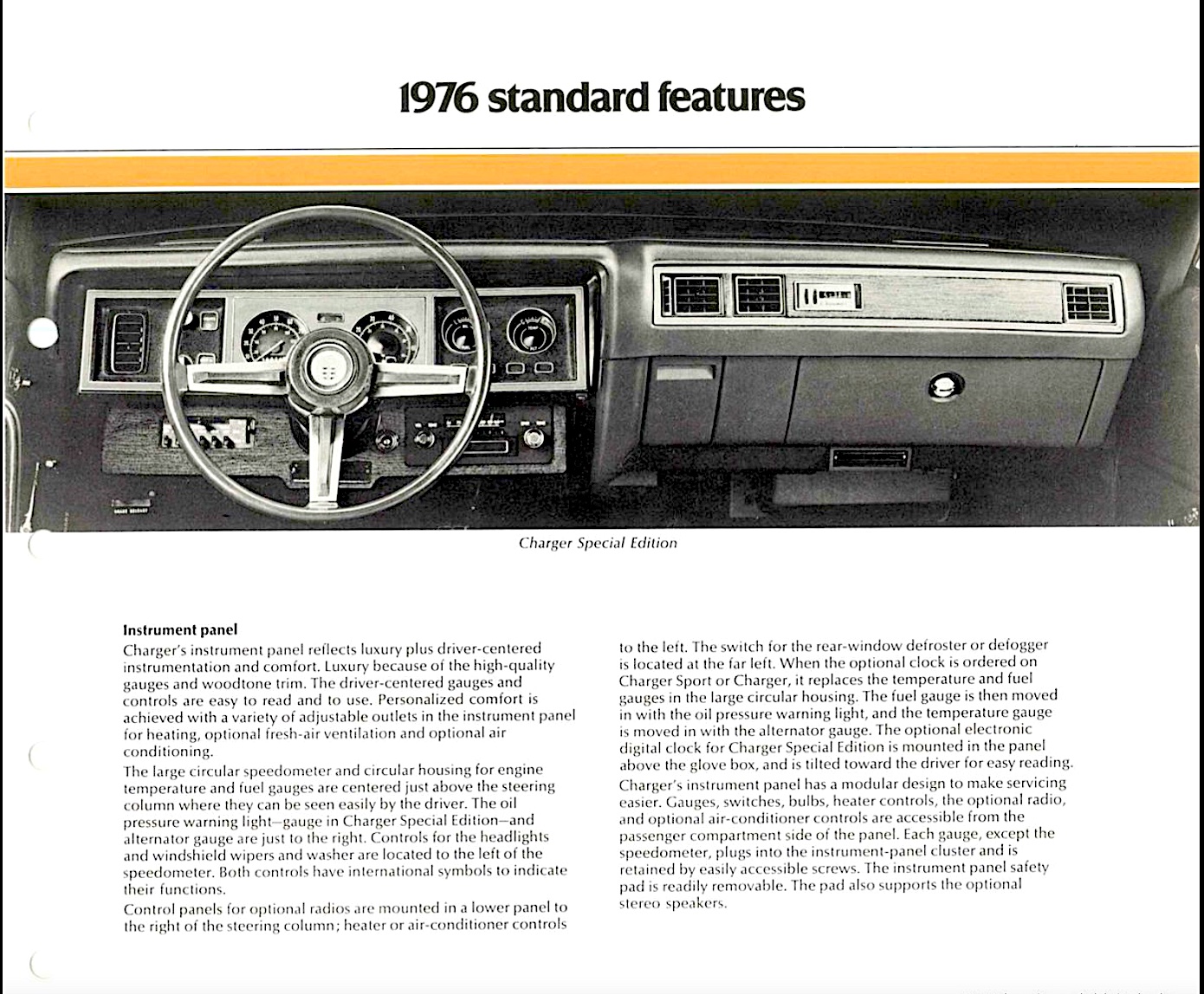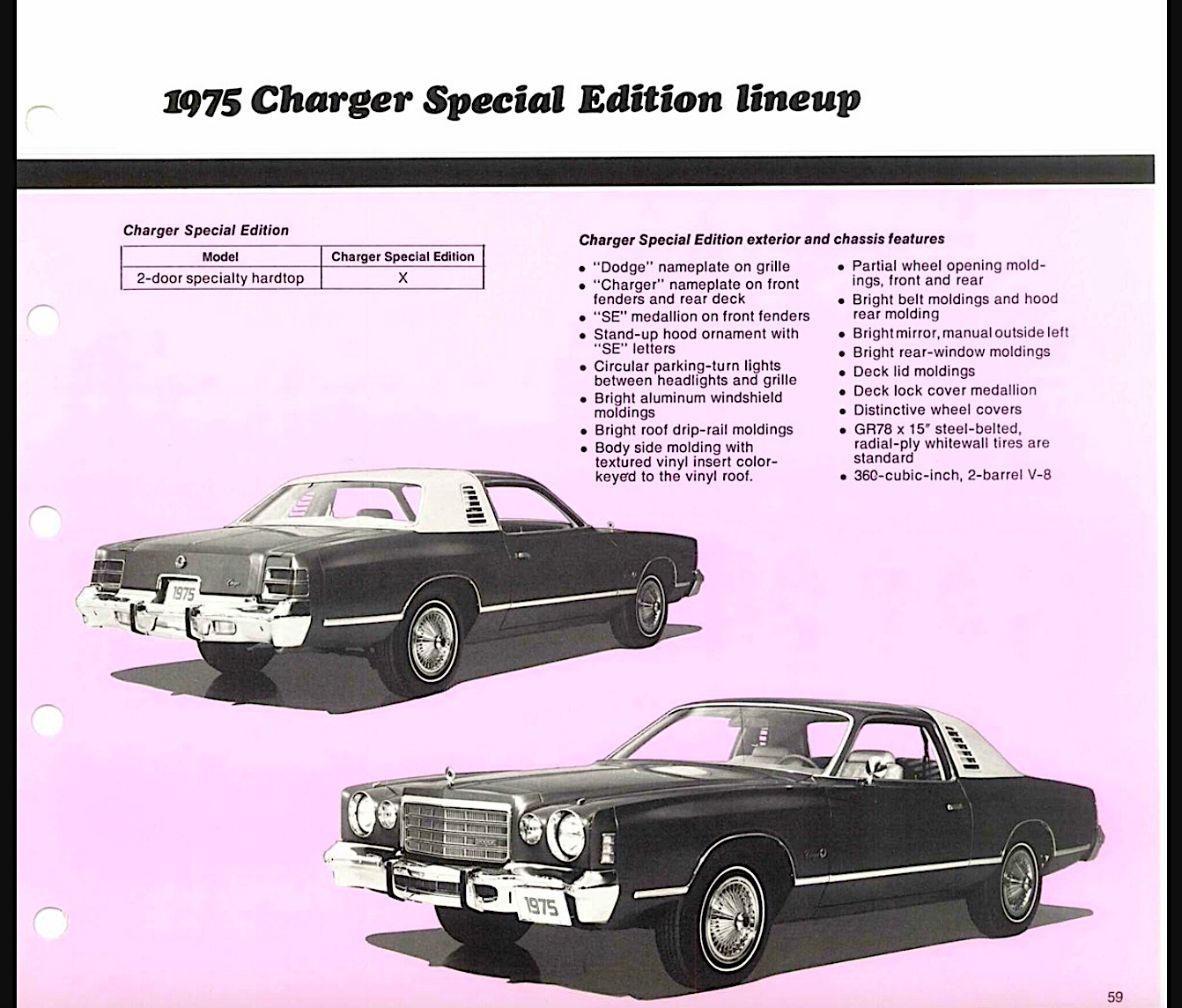 Like many things in life, there are good years and bad ones. Whether it’s politics, the economy or even the auto industry, there are eras we remember fondly, and ones we’d like to forget. For the 1975-1978 Charger, many in the Mopar® hobby would claim that these were the dark years for the iconic nameplate. The Charger had once epitomized Dodge’s focus on styling and performance in the late 1960s and early 1970s. However, by 1975, times were changing. Rock ‘n roll began to give way to disco, shirt lapels got bigger and the horsepower ratings got smaller. After coming off a prior year that included the Rallye package with an optional 440-cubic-inch big block V8, the totally overhauled Charger for 1975 was a far cry from the heavy-hitter it once was. The 440 Six Pack, 426 HEMI® engine, hood scoops, spoilers and wild colors were all a distant memory. All the Dodge Scat Pack marketing campaign materials the Ross Roy advertising agency had created were now pitched in a dumpster behind their building. The future was uncertain, and that left the product planners scrambling to figure out the Charger’s future. Should it still be the performance powerhouse it once was, or should the focus be on other areas? They chose another path: affordable personal luxury and fuel economy.