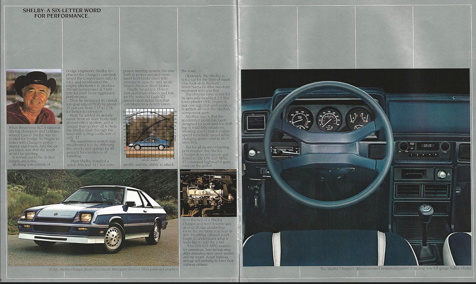 Within a few months, the relationship between Lee Iacocca and his buddy and racing legend Carroll Shelby came to fruition on the new “Shelby Charger”. Shelby was now on Chrysler’s payroll, and he was about to work his magic once again. This car began life as a Charger 2.2, but in true Shelby fashion, he made it better. At their modification center in Southern California, the team at Shelby added an aggressive front fascia with lip spoiler, lower body-side sills, large 15-inch aluminum wheels with wide Goodyear Eagle GT tires, heavy-duty shocks with performance coil springs, one-piece rear-quarter window and color-keyed bucket seats with Carroll Shelby’s famed “CS” logo. The Shelby technicians, being road racers themselves, also repositioned brake and accelerator pedals for heel-toe shifting. Visually, the Shelby Charger looked tasteful and aggressive with silver exterior paint with blue accent decals, or blue exterior paint with silver accent decals.