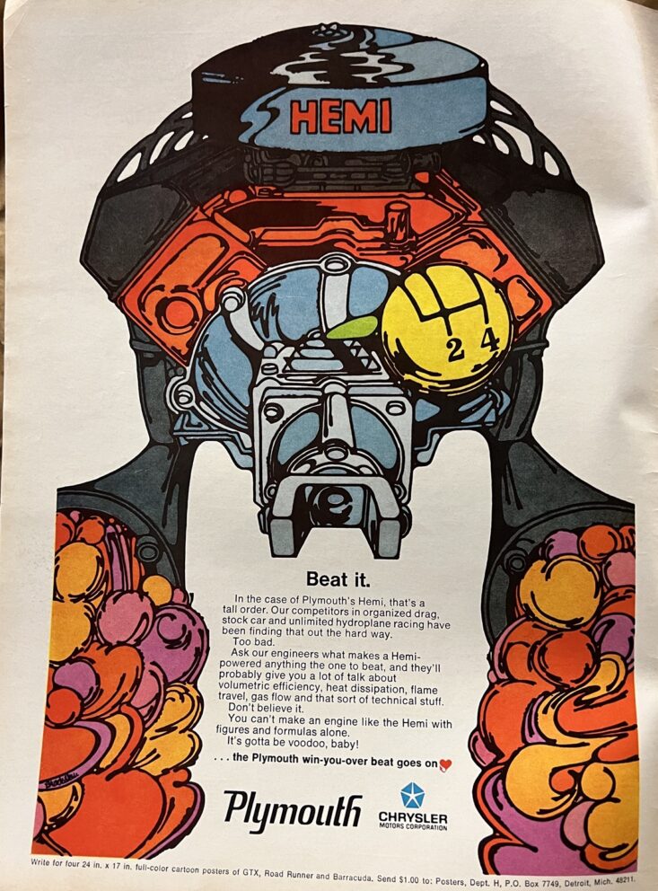 Now Chrysler was once again back in NASCAR’s battleground of trading paint and rubbing fenders with the Ford and Mercury factory teams and a handful of independent Chevy racers who had to beg for parts out of the backdoor of GM’s Tech Center. Richard Petty picked right back up where he left off winning races and the world was right again. The staging lanes at drag strips were also packed with 426 HEMI engine-powered cars battling down the quarter-mile, while on Main Street, USA, many stoplight skirmishes were unfolding with HEMI muscle cars beating the guy in the next lane like a drum. These environments were a breeding ground for the HEMI engine to stake its rightful place. It may have been born out of a necessity to bring Chrysler coveted racing championships, but the 426 HEMI engine was starting to become a nationwide terror. Those four letters, when adorned on the sheet metal of a Dodge or Plymouth, would guarantee the driver a jousting match against some zealous GTO owner that got sucked into Pontiac’s creative marketing campaign, which over-inflated their car’s performance. Despite some catching up to do in captivating the youth market, Chrysler’s Dodge and Plymouth divisions aggressively ramped up, and by 1968, countless Plymouth Road Runners and Dodge Super Bees dotted the boulevards of stoplight drags across the country.