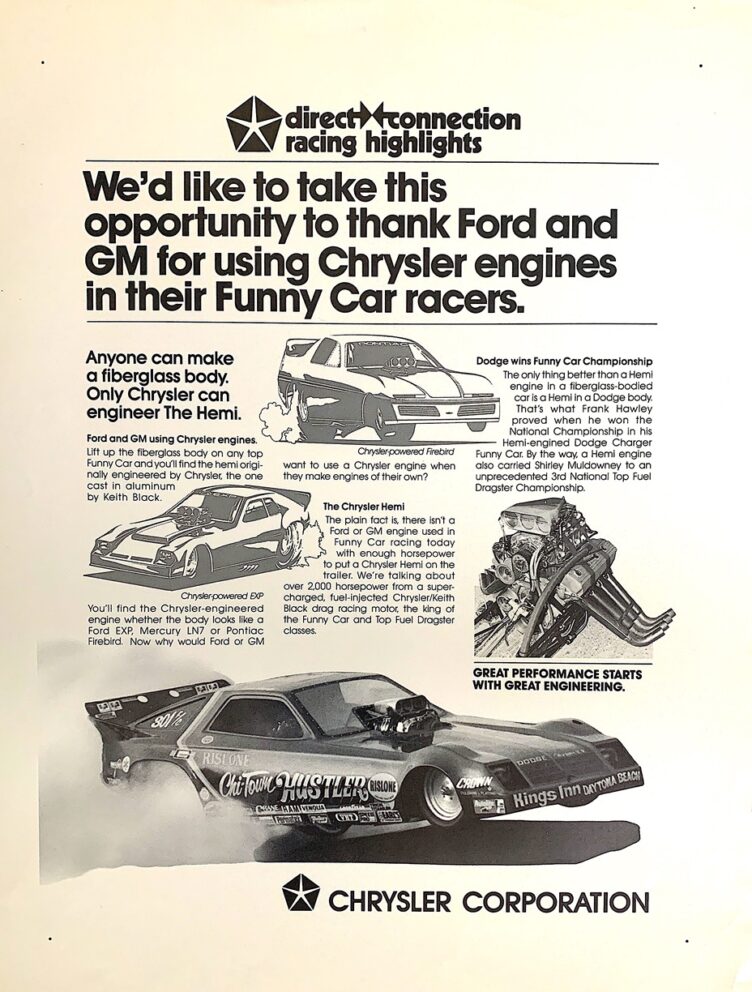 It was created to win races on NASCAR’s high-banked ovals and NHRA drag strips all over the country. Designed and engineered in a time when man just barely tickled the earth’s orbit while being shot up in his Mercury Atlas rocket, it would also be the start of another Space Race. The dyno rooms at Chrysler’s Highland Park, Michigan, engineering facility were humming 24/7 with endless activity while technicians in white lab coats danced back and forth between the test cells recording data. The 426 HEMI® V8 engine, undoubtedly one of the greatest engines to ever emerge from Detroit, turns 60 this year and shows no signs of retiring or filing for social security. The basic engine architecture of the 426 HEMI engine is still the template for today’s nitro-infused 12,000-horsepower Top Fuel Dragsters and Funny Cars that can propel a human being from a dead stop down 1,000 feet in well under four seconds at over 300 mph. For those racing with production-based cars, the 426 HEMI V8 engine still powers many Super Stockers and Stockers that compete and win races in NHRA’s Sportsman classes. Had the diehard Chrysler engineers who created this monster known about the 426 HEMI engine’s decades-long lasting power, they would’ve asked for royalty payments instead of their meager salary. So on this day of days, 4/26, or as it’s known among the Mopar® faithful, #HEMIDay, let’s take a look back on what made this engine a legend that has stood the test of time.