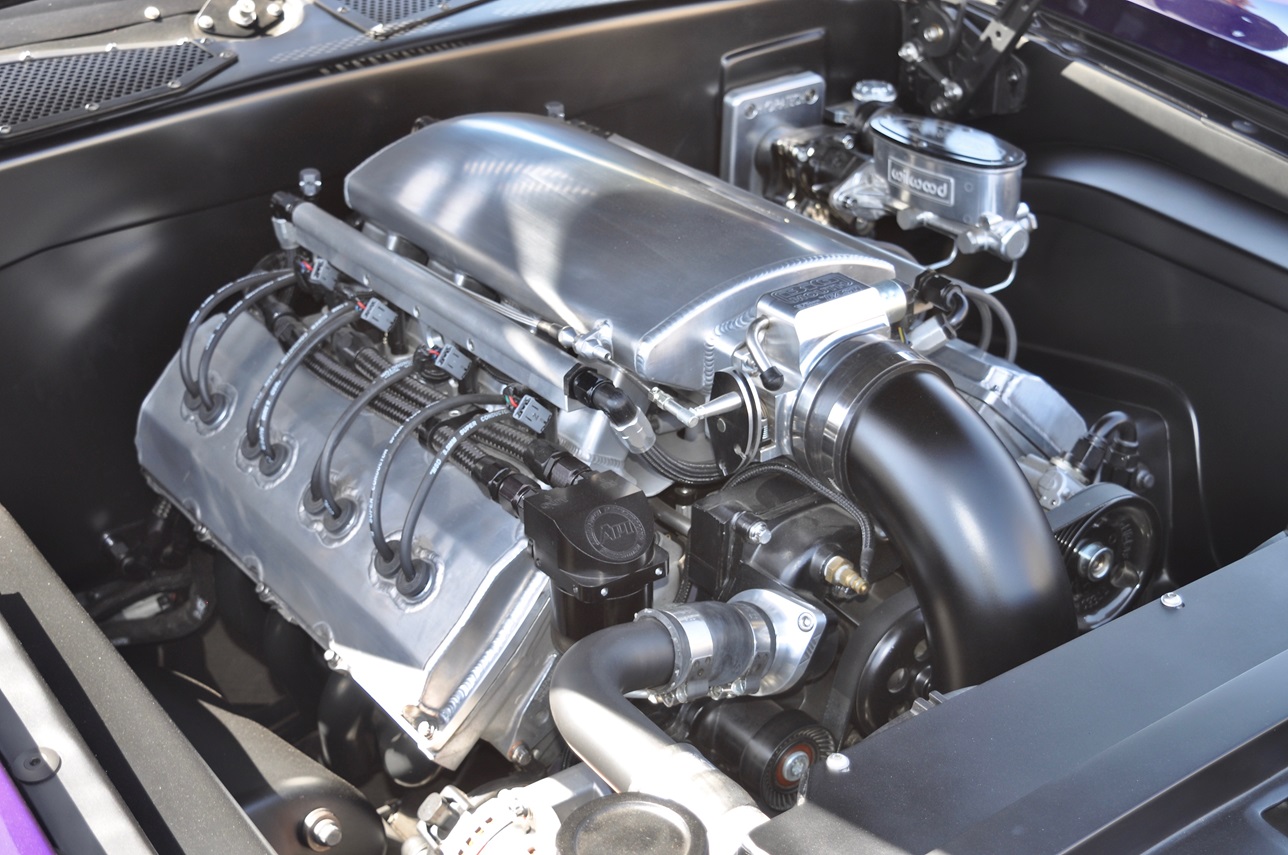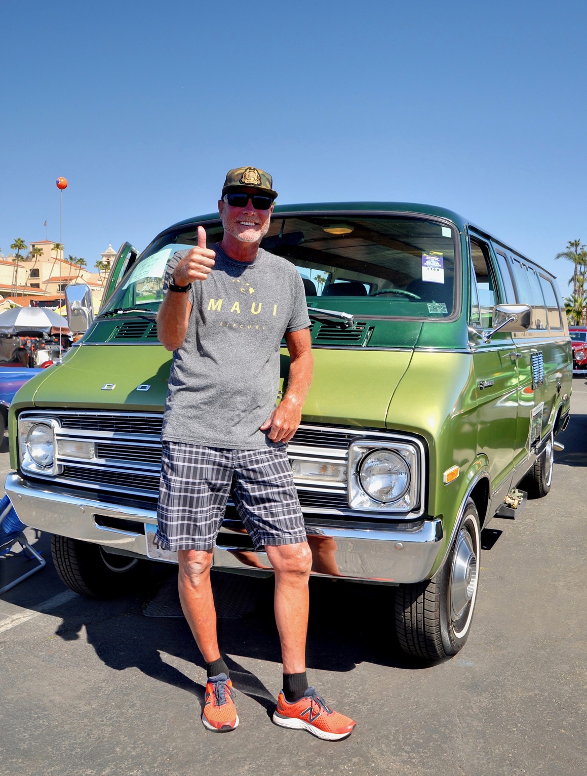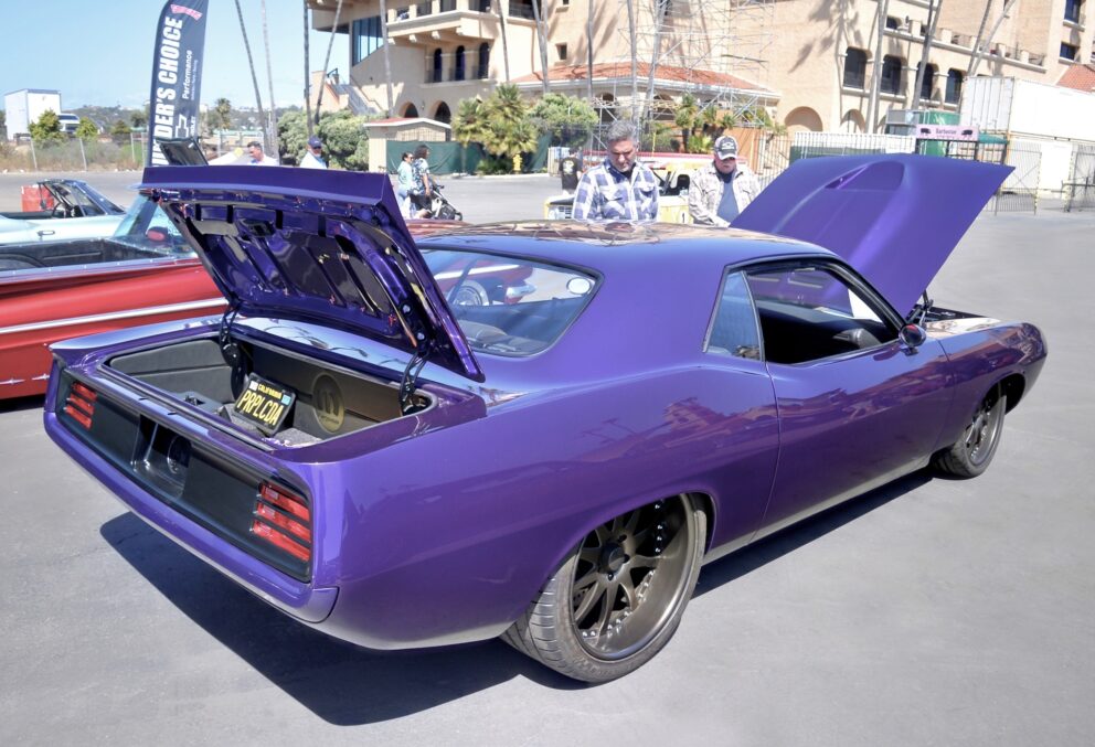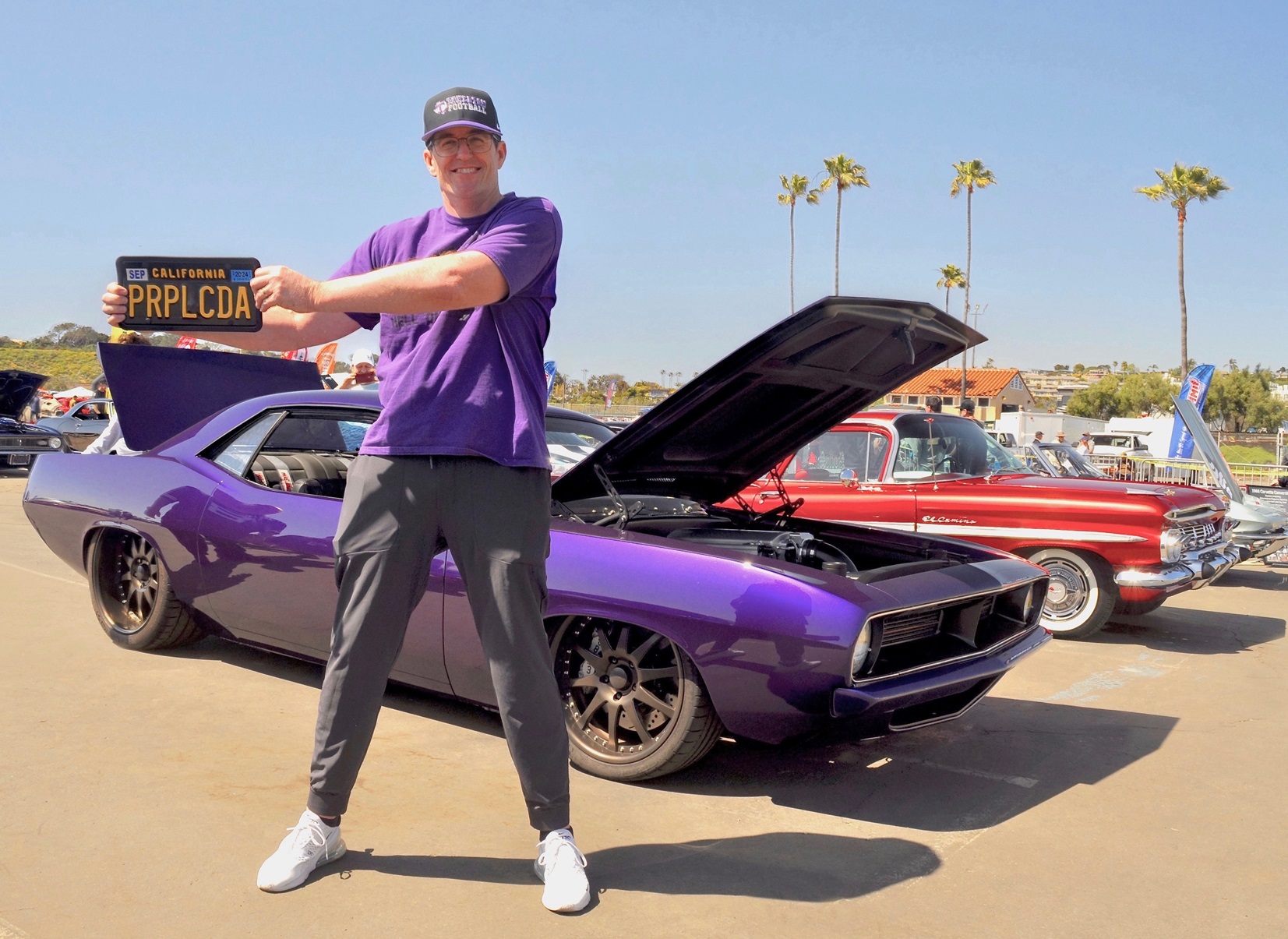 This owner-built 1970 Plymouth Barracuda started out in life as a 318 car and in recent times it has been completely “resto-modded” front to rear, including the fitting of a GEN III 600-hp HEMI® engine displacing 426 cubes! 18/19-inch rollers and of course a coat of custom-blended purple, just like the good ol’ days of the original “High Impact” colors. Super detailed! Owner Ned Jackson with the personalized California plate…