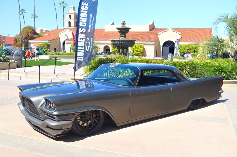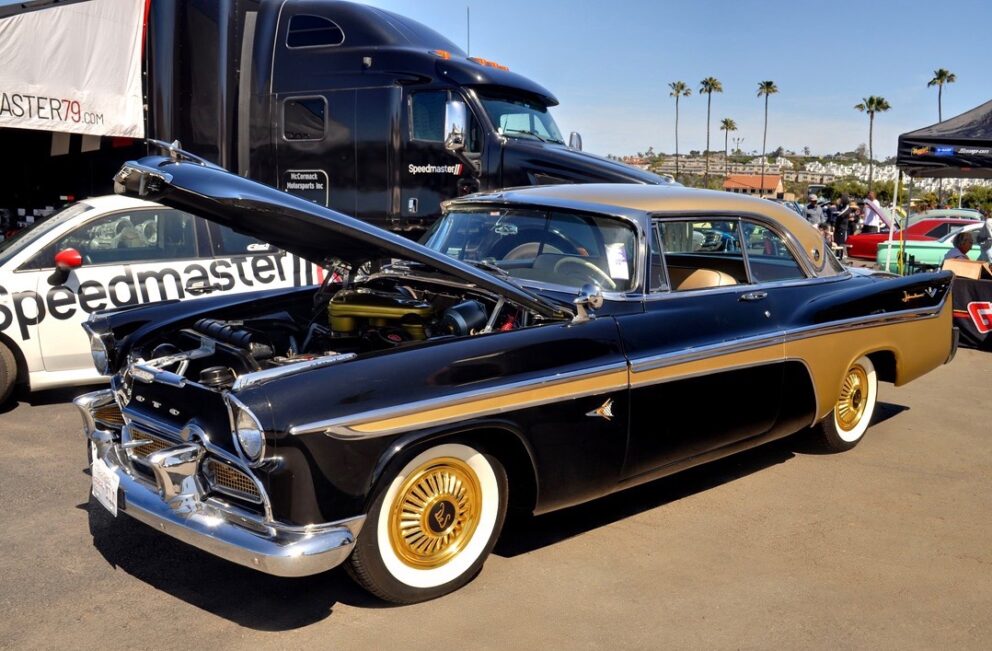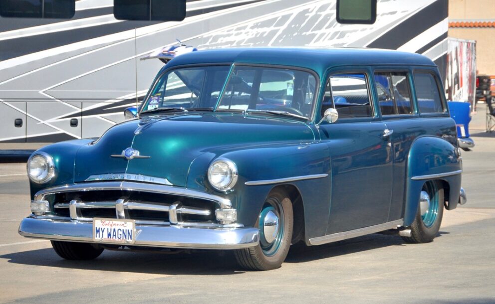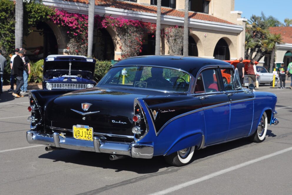 Major league variety of ’50s Mopar vehicles spotted in Del Mar: 1953 Plymouth 2-door wagon with DeSoto Firedome HEMI engine power, ’55 Plymouth Savoy Club Sedan, 1956 Dodge Custom Royal 4-door, ’56 DeSoto Adventurer with 341 HEMI engine power, and a radical 1959 300E Letter Car with 1,000-hp SRT® Hellcat HEMI engine power!