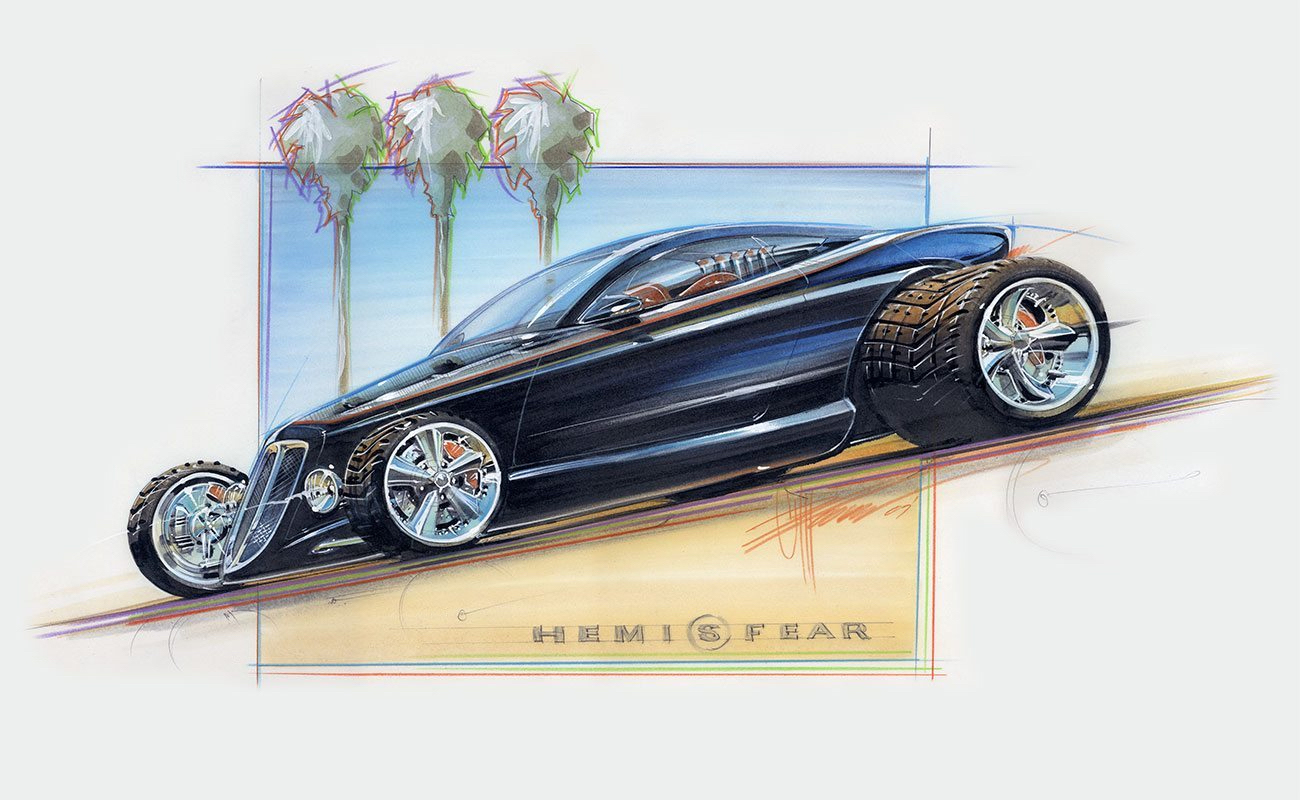 “I looked at ’Cudas and Challengers, the cars that we all know and love,” remembers Chip. “I did a proposal at home, but I went all the way back to the ’30s.” Tom Gale was the president of design at Chrysler at the time. “We can go back and grab from forms that were fantastic in the past and evolve them into something new,” Chip reasoned with Gale. “Tom Gale just fell in love with it!”