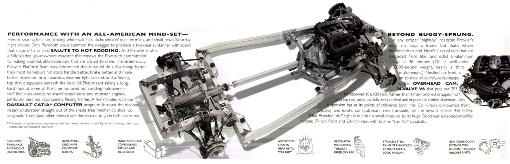 Plymouth Prowler is a tribute to the American hot rod culture and a rolling testbed of technology. Due to its limited volume and highly-focused nature, Prowler has taken a number of ‘reach out’ experiments in technology, process, marketing and unique supplier relationships, all of which are having tremendous positive applications.