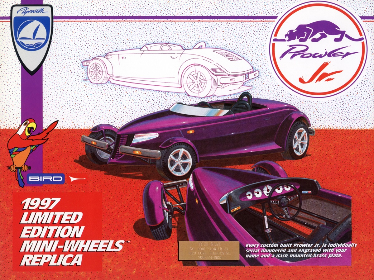 Powered by a 3.5-horsepower Briggs 4-cycle single cylinder engine, Bird offered a miniature 81-inch long, 200-pound rear-engined “Mini-Wheels” replica of the Prowler, with optional 5-horsepower engine upgrade. Fitted with a fiberglass body and top speed of 35 mph, it was fun for the whole family!