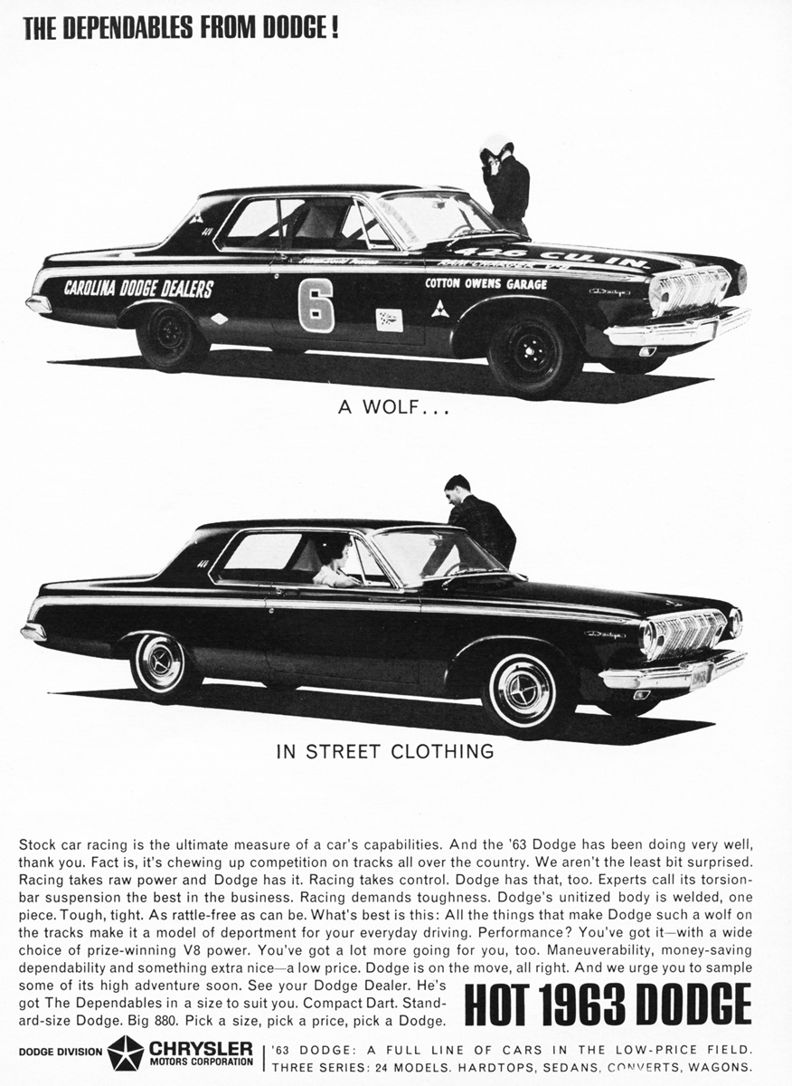 “Stock car racing is the ultimate measure of a car’s capabilities. And the ’63 Dodge has been doing very well, thank you. Fact is, it’s chewing up competition on tracks all over the country.”