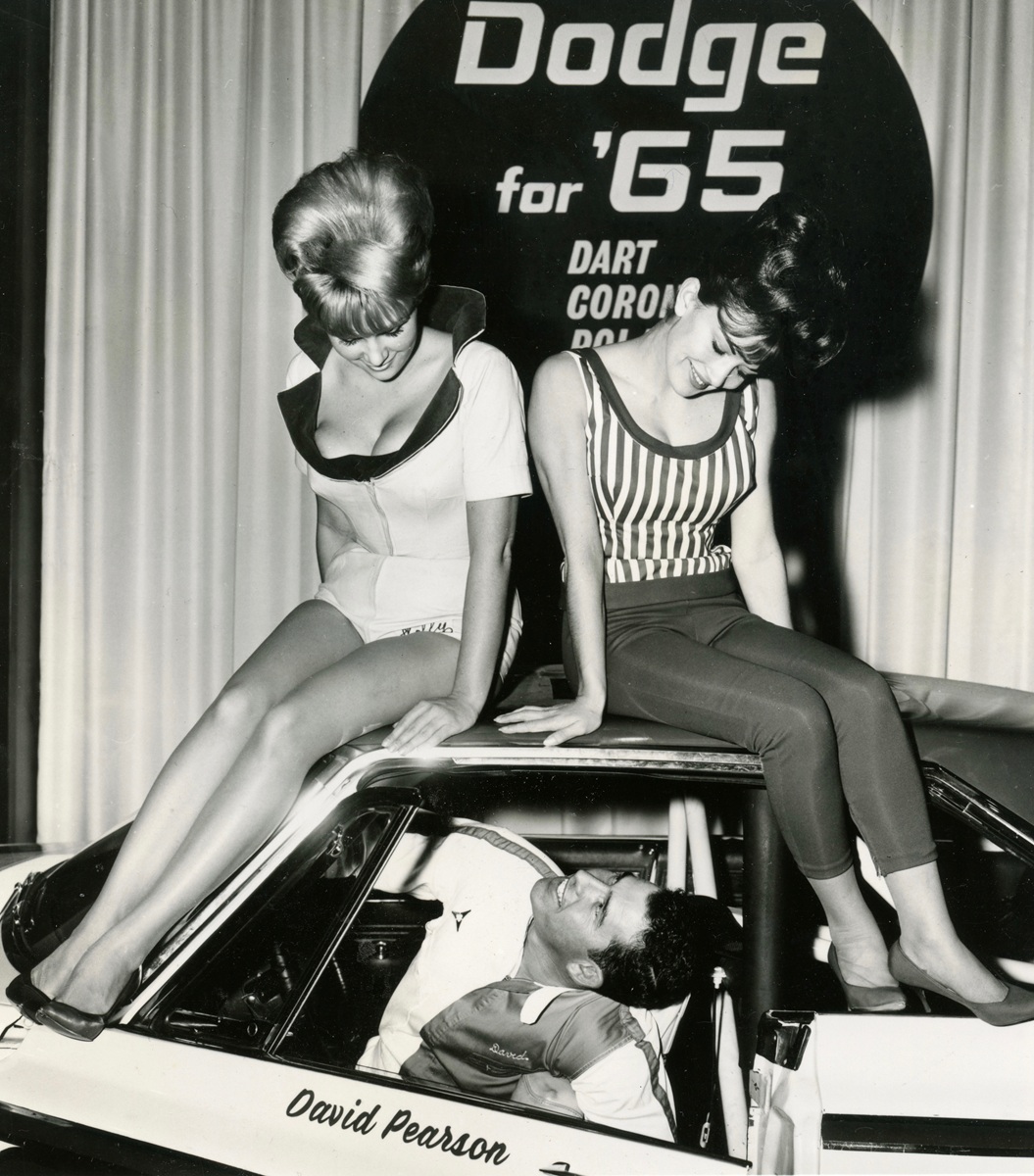 In this Dodge publicity photo, driver David Pearson is seen behind the wheel of a 1965 Dodge Coronet at the Detroit Auto Show – the very car he would use to dominate classic short dirt tracks.