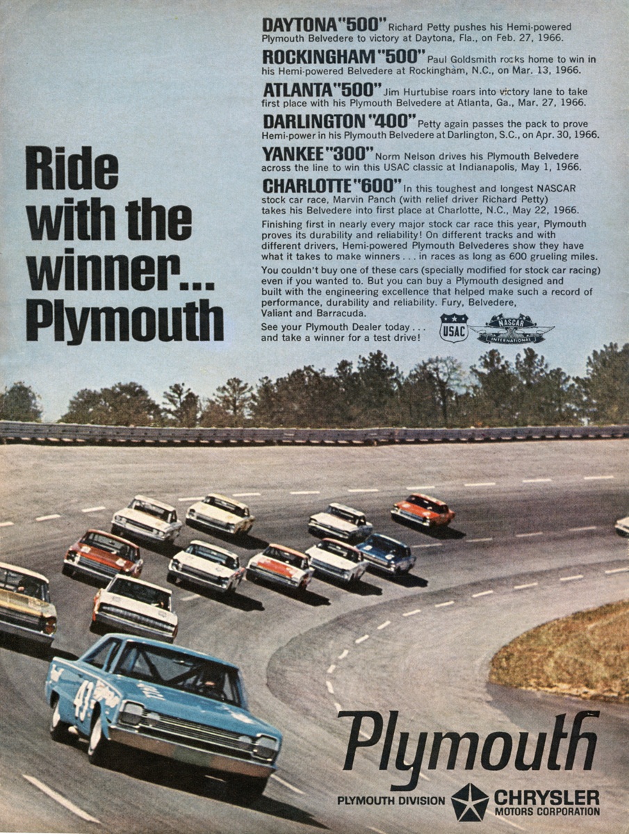 In mid-1966, Plymouth ran a bold magazine ad in top car enthusiast publications, showcasing the brand’s success on the NASCAR and USAC circuits. The ad highlighted wins by Richard Petty, Paul Goldsmith, Jim Hurtubise, Norm Nelson and Marvin Panch – a star-studded lineup that proved Plymouth’s racing pedigree.