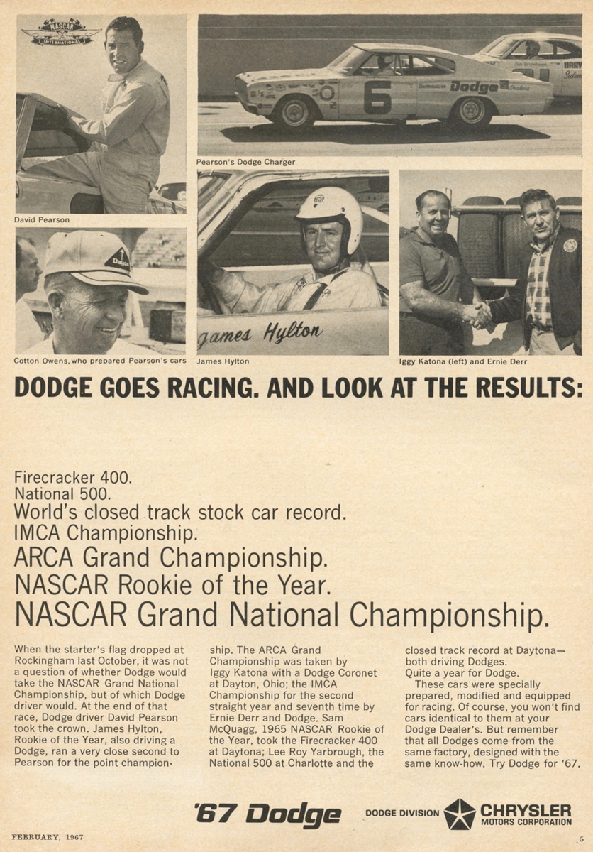 In February 1967, Dodge ran a powerful ad celebrating its performance in the 1966 NASCAR Grand National Championship. The brand proudly highlighted David Pearson’s championship win behind the wheel of a factory-backed fastback Dodge Charger, built and fielded by legendary team owner Cotton Owens.