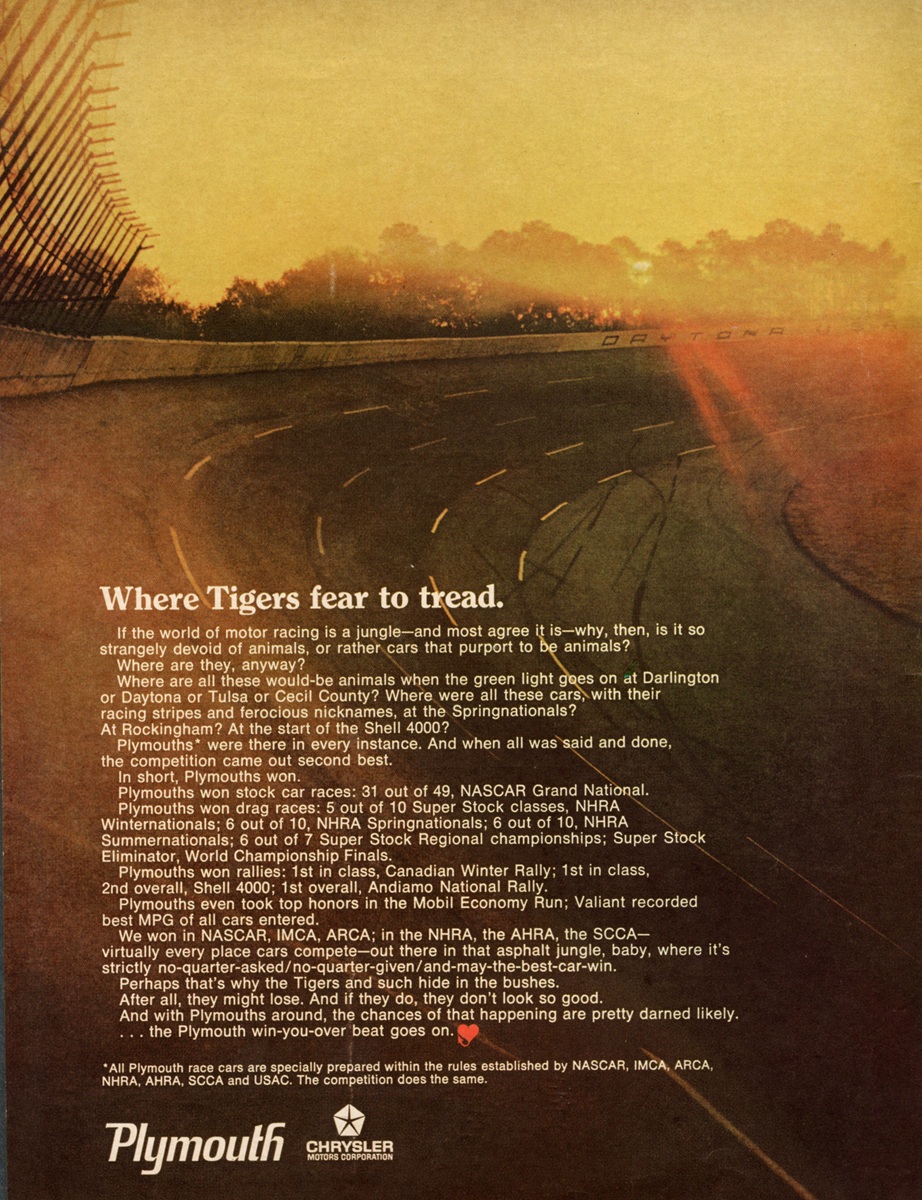In early 1968, Plymouth released a striking advertisement that stood out by what it didn’t show – no cars, just a dramatic corner shot of Daytona International Speedway. The headline read: “Where Tigers fear to tread.”