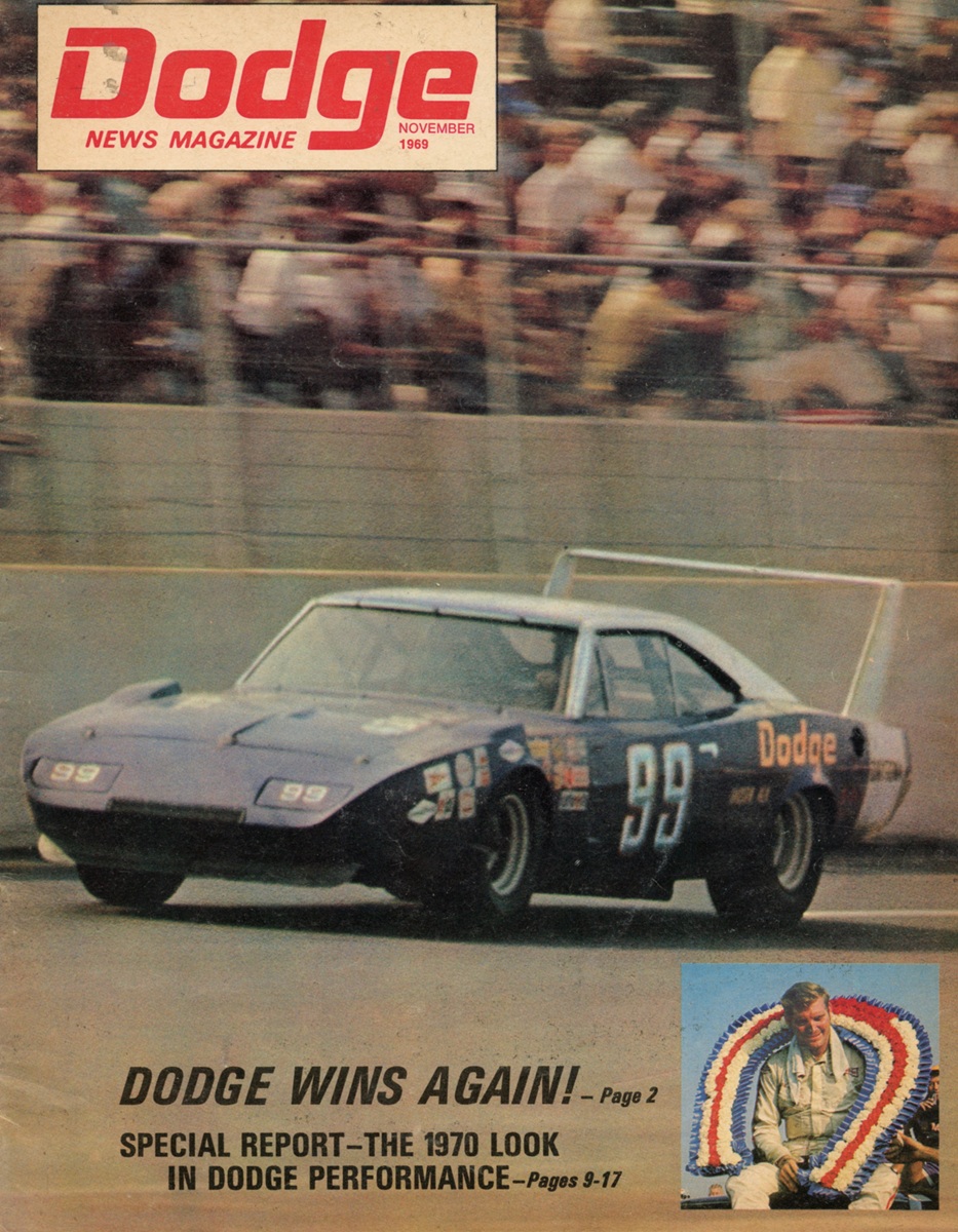 The November 1969 issue of Dodge News Magazine featured a striking cover shot of the #99 Dodge Charger Daytona, driven by Richard Brickhouse to victory at the inaugural Talladega 500. Topping speeds of 195+ mph, the Daytona made a bold statement – not just in design, but in performance.