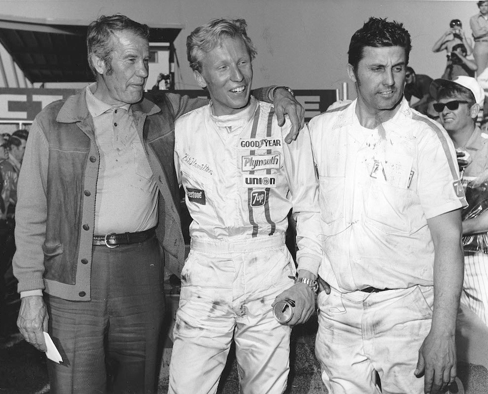 In the Winner’s Circle at the 1970 Daytona 500, Lee Petty (left) celebrates alongside rookie sensation Pete Hamilton (center) and master engine builder Maurice Petty. The victory marked a major moment – not just for the Plymouth Superbird, but for the triumphant return of Petty Enterprises to the Chrysler fold.