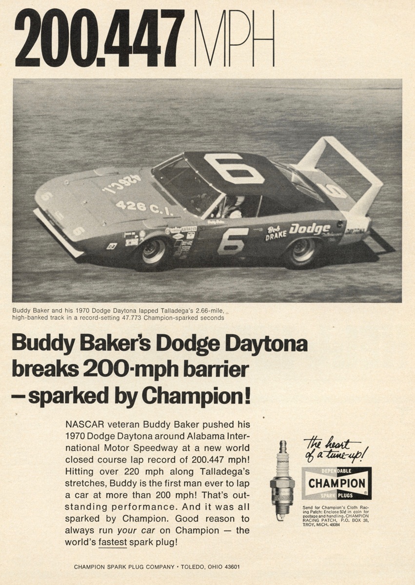 On March 24, 1970, Buddy Baker etched his name into the record books by becoming the first driver to break the 200-mph barrier on a NASCAR superspeedway. Behind the wheel of a Dodge Charger Daytona, Baker averaged 200.447 mph around the high-banked 2.66-mile Talladega Superspeedway, a feat so groundbreaking it was celebrated in a Champion Spark Plug national magazine ad.