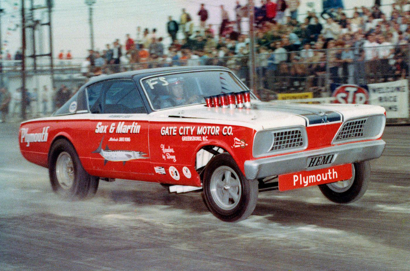 In 1966, Ronnie Sox and Buddy Martin made the move to an injected HEMI engine-powered Barracuda Funny Car, nicknamed the “Baccaruda.” With a fuel-burning, injected HEMI engine, a stretched wheelbase and a lightweight 2,200-pound frame, the car was a monster. It featured eight 26-inch-tall ram tubes and ran on a potent mix of nitromethane and alcohol. Equipped with headers from Doug Thorley, the Baccaruda clocked 8.70-second passes at over 150 mph – and won an astounding 70 out of 90 races that season.