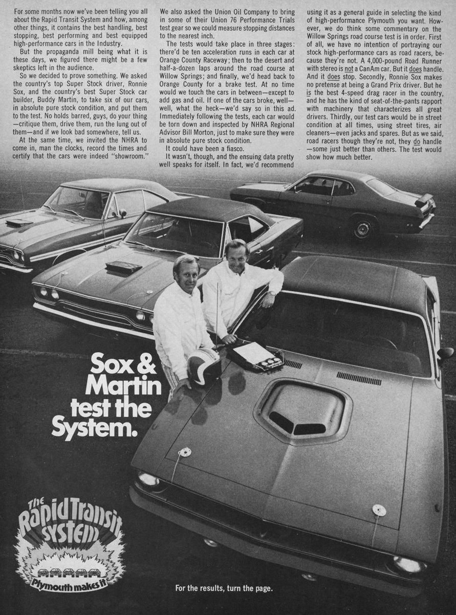 When Plymouth introduced its 1970 performance lineup, it was branded as “The Rapid Transit System.” To showcase just how fast these cars were straight from the showroom, Ronnie Sox was tapped to put them to the test on the drag strip – and the results were featured in national magazine ads. The testing took place at Orange County International Raceway, with NHRA officials present to certify that the vehicles were bone-stock, right down to the power steering, radios and other “unnecessary” options.