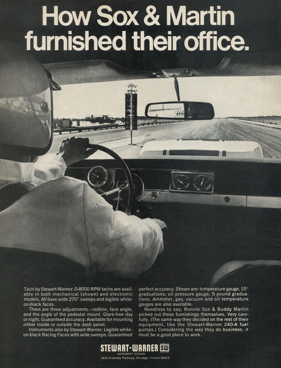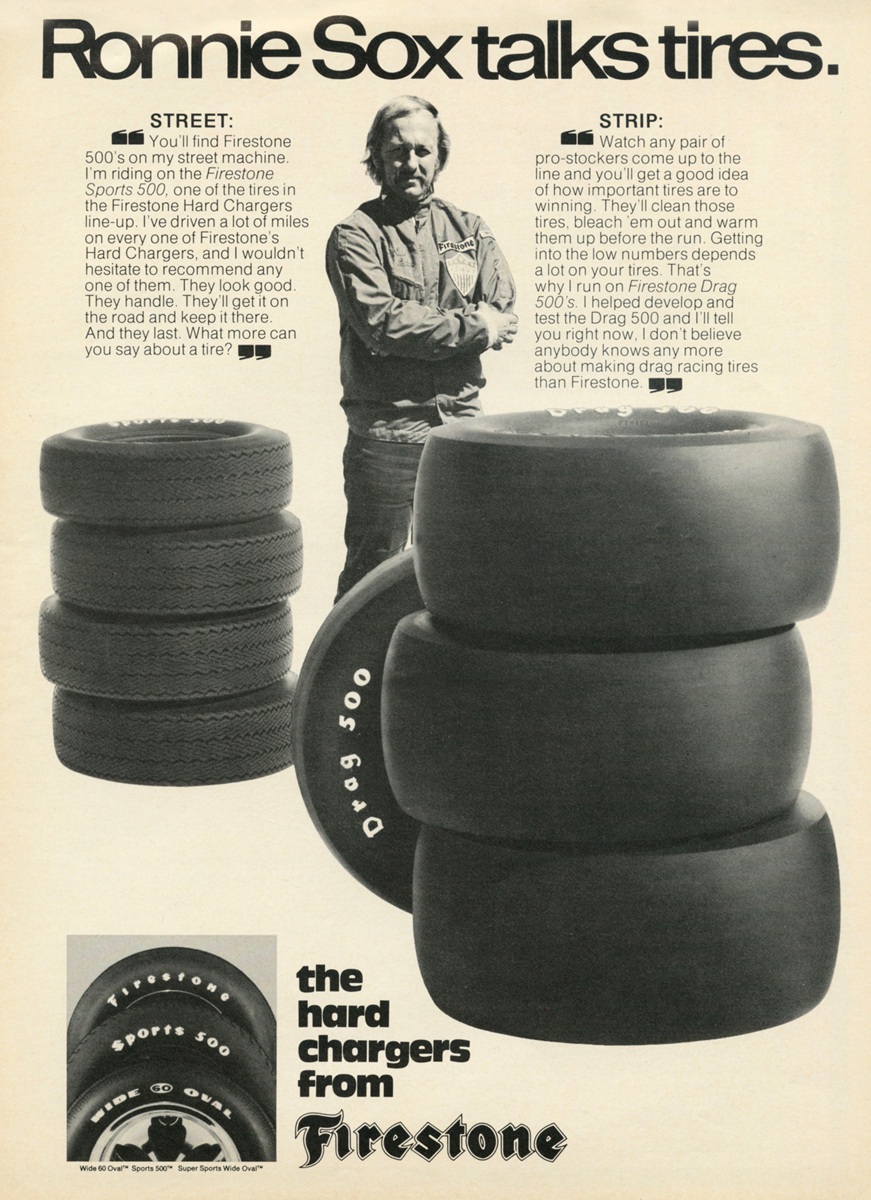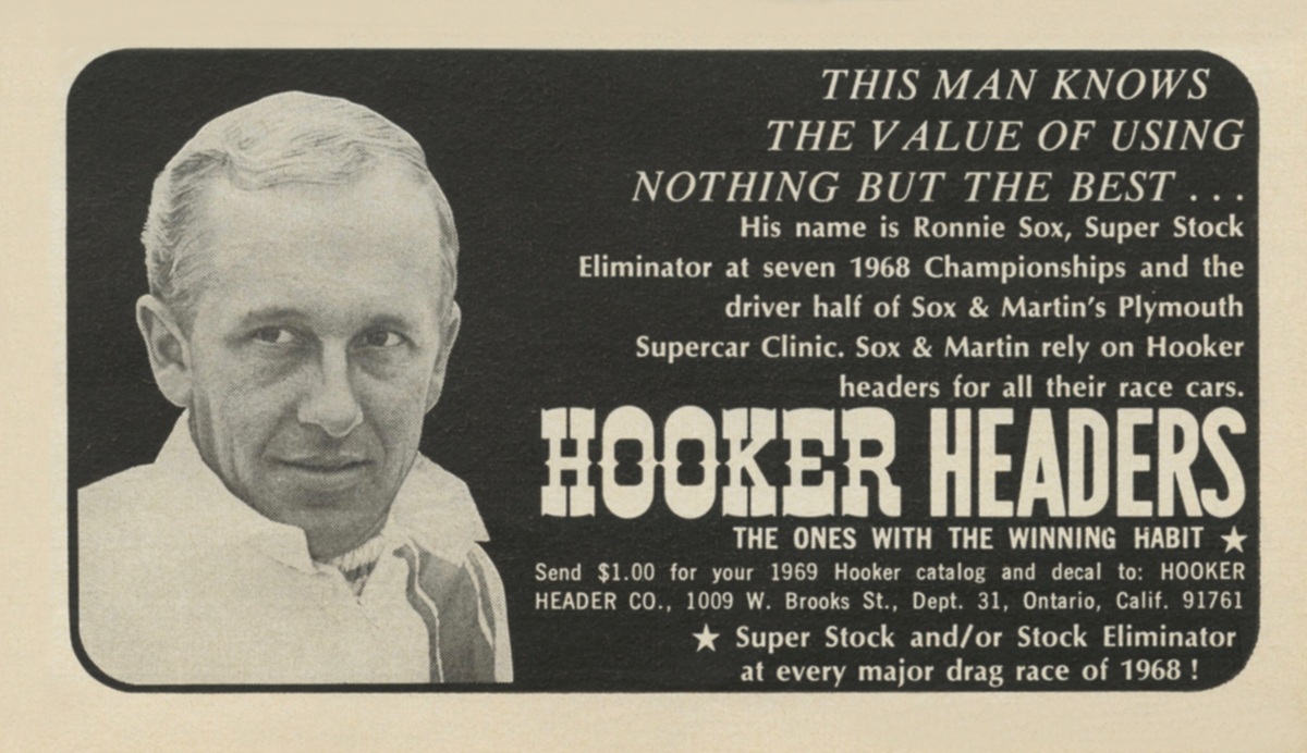 During his years of dominance, Ronnie Sox became a go-to figure for performance brands looking to align with a true winner. He was prominently featured in advertising campaigns for Hooker Headers, Stewart-Warner Instruments, Valvoline Oil and Firestone Tires. The Sox & Martin team also appeared in marketing for other top-tier brands, including Hurst, Champion Spark Plugs, Fram Filters, Edelbrock, Mr. Gasket, Federal-Mogul Bearings and Keystone Wheels – further cementing their status as icons of the muscle car era.