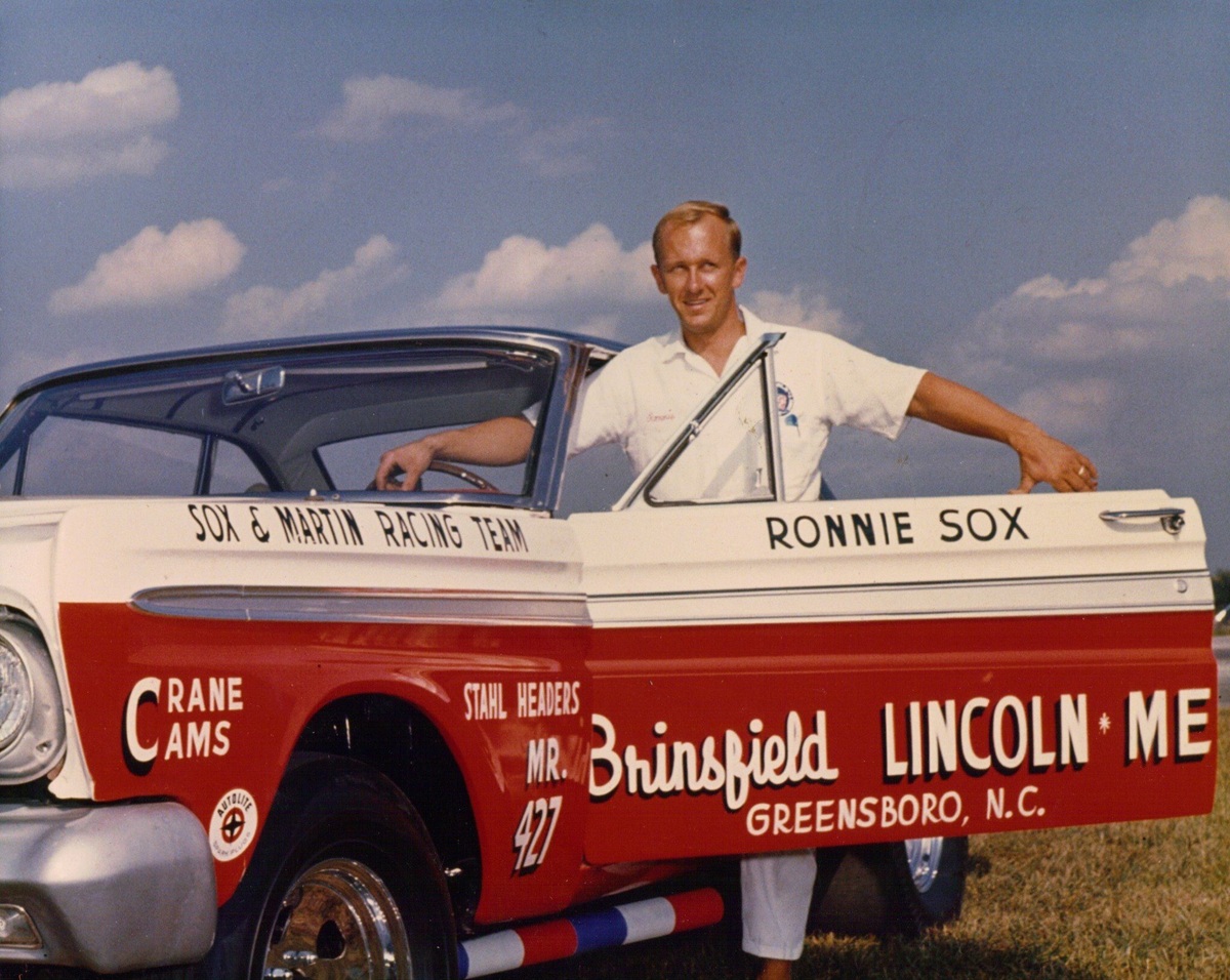 Ronnie initially raced Fords, Pontiacs and Chevrolets, but by 1962, he was behind the wheel of a 1962 Dodge post car powered by a 413 Max Wedge engine. The car, owned by Ronnie Cox, was emblazoned with “Mr. 413” on the front fenders and “Sox Sinclair” on the rear quarters – named after the gas station owned by Ronnie’s father.
