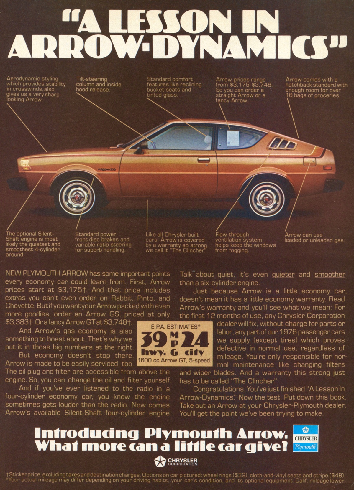 Besides the “Arrow-Dynamics” headline, the advertising also promoted the estimated 39 miles per gallon, plus the 12-month warranty on basically everything except tires.