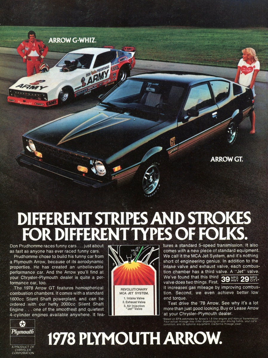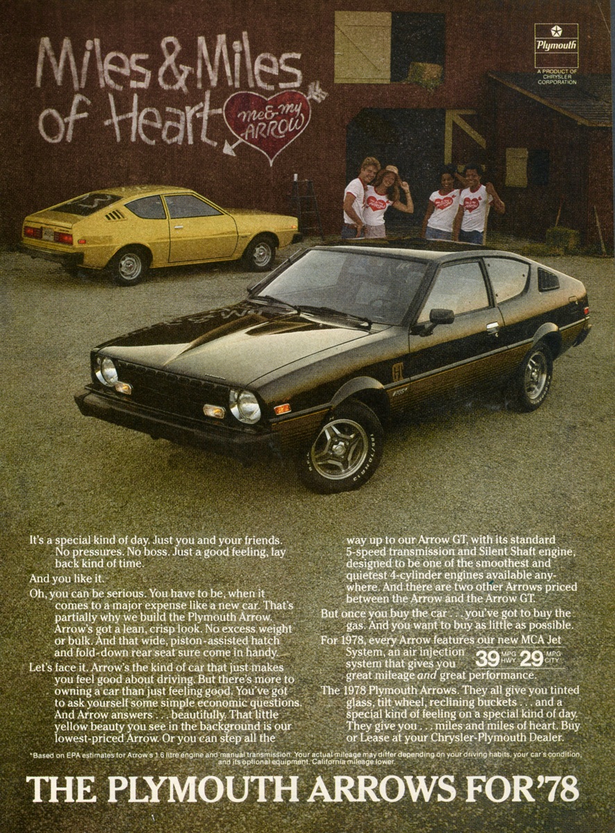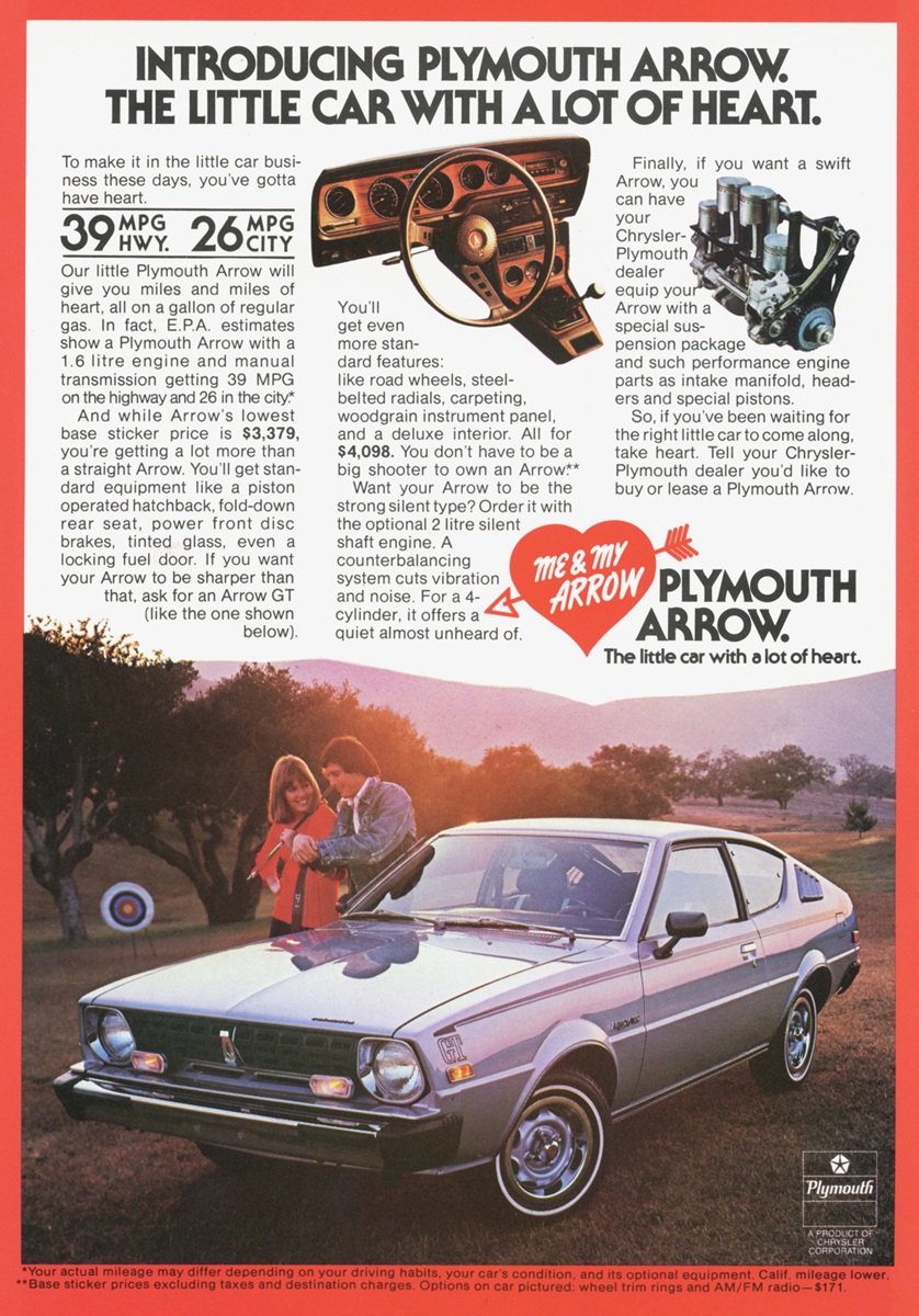 The advertising campaign showed a red heart with an arrow through it. It had the tagline, “The little car with a lot of heart.” Happy people wore T-shirts with the same logo. The Arrow was sold to anyone who wanted good fuel mileage. It also had a youthful charm.