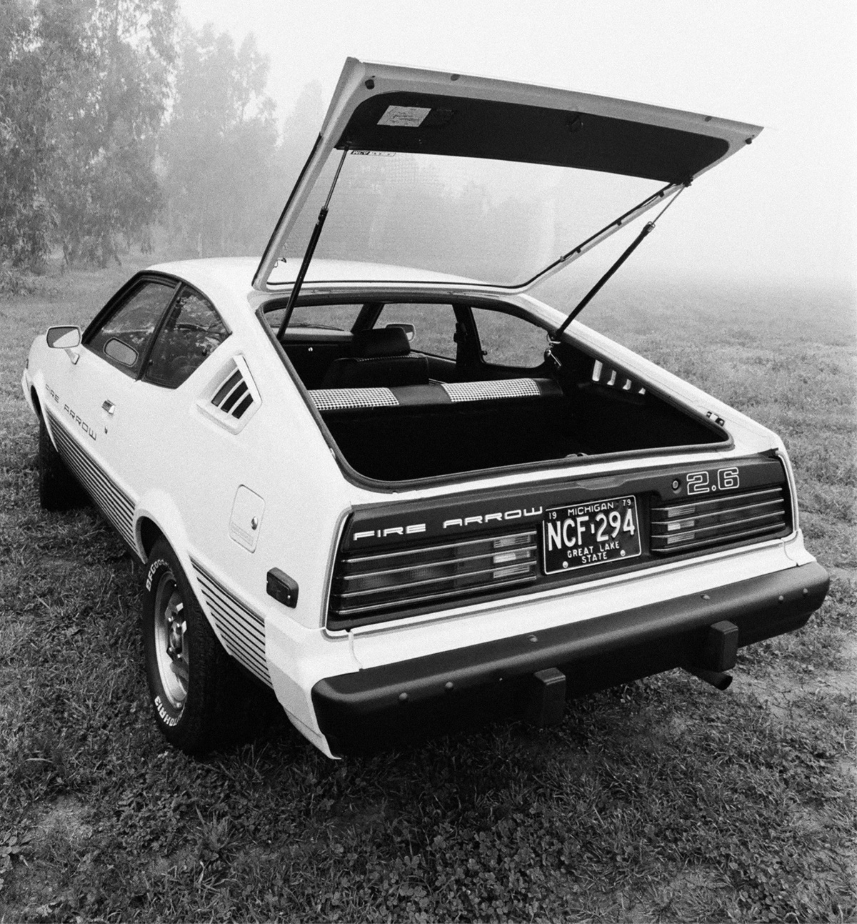The Fire Arrow has a 2.6L Silent Shaft engine with 105 horsepower. It was available in the 1979 and 1980 model years. The premium version includes cast aluminum road wheels and special bold graphics. It also features black-out window trim and 4-wheel power disc brakes. 1979 Arrows had rectangular headlamps, revised grille, 2.5-inch wider rear track and different rear glass, taillights.