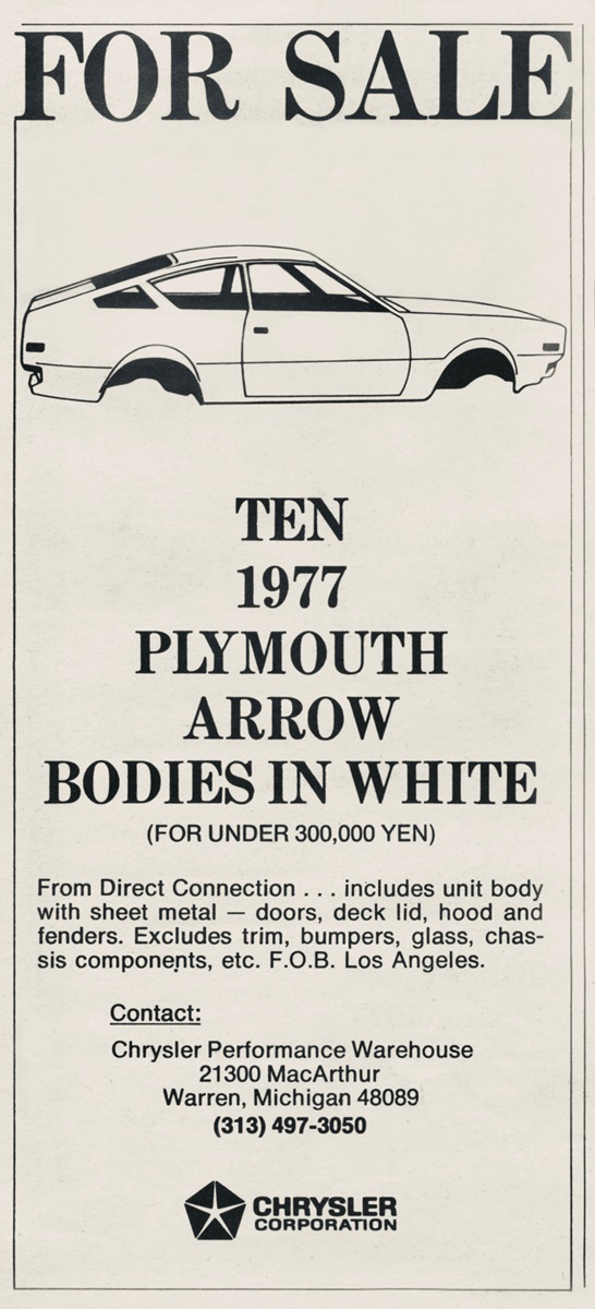 In 1977, an ad in NHRA’s magazine National Dragster offered racers a new Plymouth Arrow body. This body, called “Body in White,” was available for racecar building. Ten of these bodies were listed, and they came from Japan.