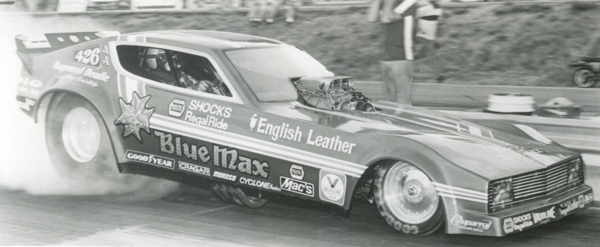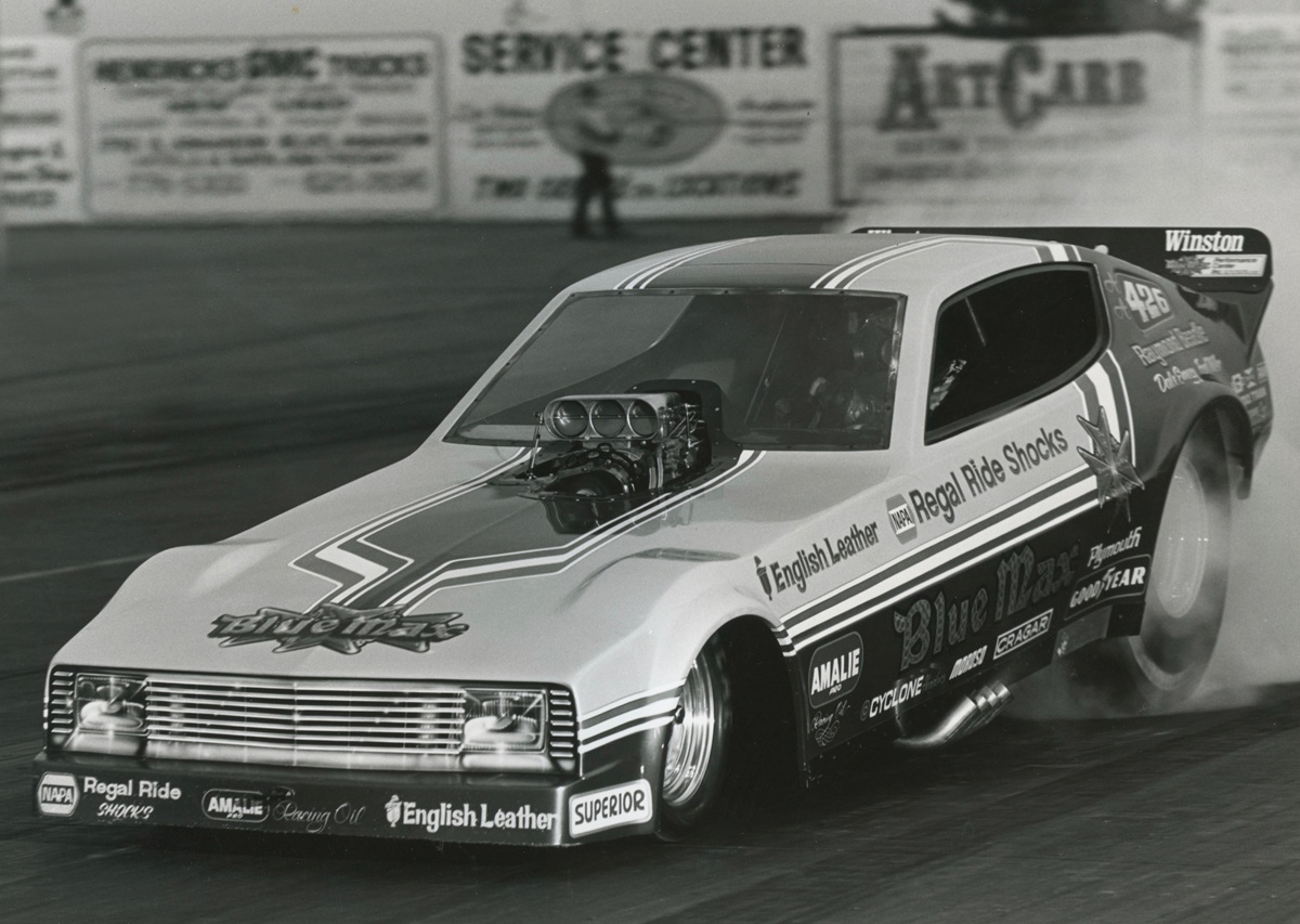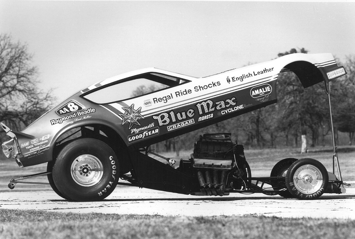 In 1978, Blue Max Racing out of Dallas, Texas, switched from a Mustang to the Arrow. Now both team owner and driver Raymond Beadle worked with artist Kenny Youngblood and painter Tom Stratton on the bold livery. The 118-inch-wheelbase Tony Casarez chassis housed a 484ci Keith Black HEMI engine with Crowerglide clutch and Lenco 2-speed trans. Beadle ran a 5.98-second pass in August 1978 – becoming the second member of the Cragar 5-Second Club, joining Prudhomme.