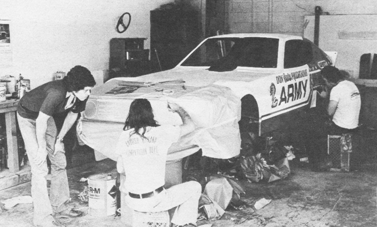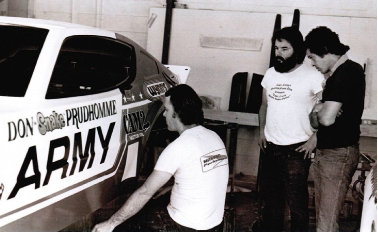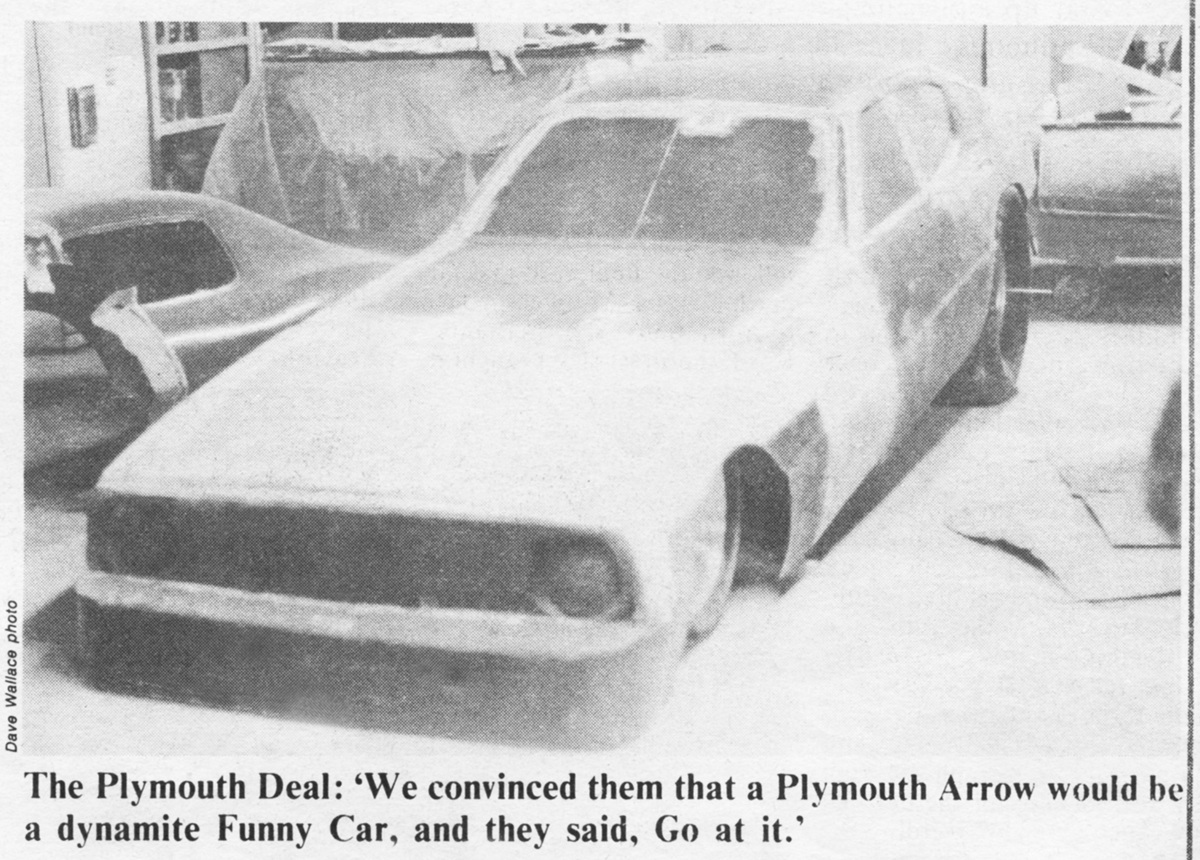 Plymouth had just launched a new compact in 1976 – the Arrow – an imported model from Japan rebadged under the Plymouth name. Snake’s deal with Chrysler revolved around using the Arrow body for his 1977 Funny Car campaign. It was his responsibility to secure a production body and get it fabricated into fiberglass form for racing. Together with his crew, Prudhomme helped George Kirby of G&K Fiberglass in Bellflower, California, bring the Arrow shell to life.