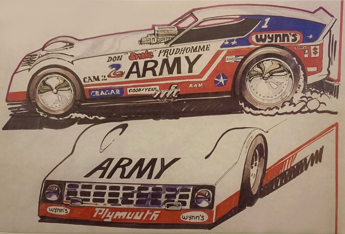The Arrow Funny Car started as a stretched Plymouth production body with custom wheel openings, a flush air dam and aerodynamic lines. Don Prudhomme even cut his Hawaiian vacation short to be there when the first fiberglass mold was pulled. The graphics mirrored his prior Monza, but with Plymouth and CAM2 branding.