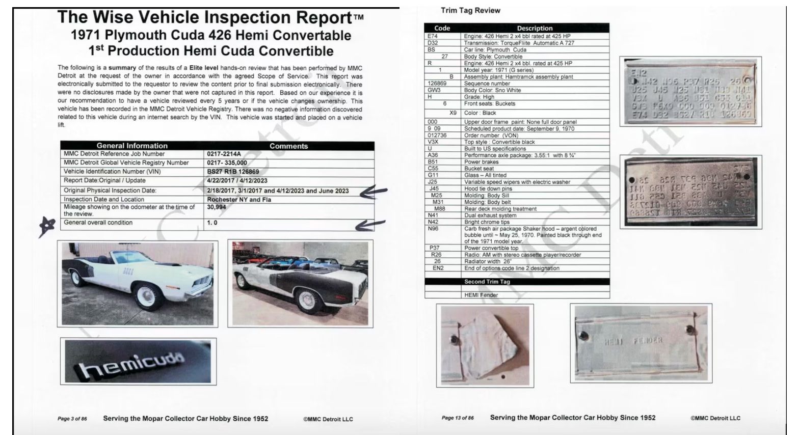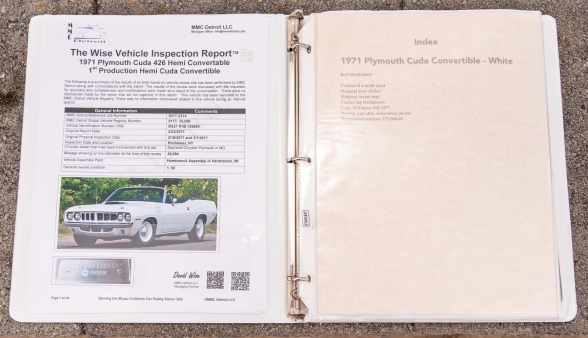 Unfortunately, nothing is known about the person or even the dealer who ordered this unique Mopar vehicle in the fall of 1970, but it was sold new in the Midwest. We pick up the trail in 1977 when it was owned by the same individual until 2003. The car was then verified and documented before longtime Mopar Muscle Restorer Julius Steuer began his year-long renovation effort. In 2003, he took the ’Cuda back to its as-built specifications, which included repainting the car back to its original GW3 ‘Sno White’ exterior color with matching colored front grille (another option on the 1971 Plymouth ’Cuda models). Mopar Expert Dave Wise of MMC Detroit examined the ’Cuda in 2017 and 2023, and crafted his trademark detailed report on the options and features that validate the HEMI ’Cuda as the ‘real deal.’ Dave’s reports also included numerous illustrations to substantiate the car’s authenticity. These included the ’Cuda’s 1977 Kansas title, a partial broadcast sheet, the original tags found on the carpet and doors, and many photos showing the restoration process.